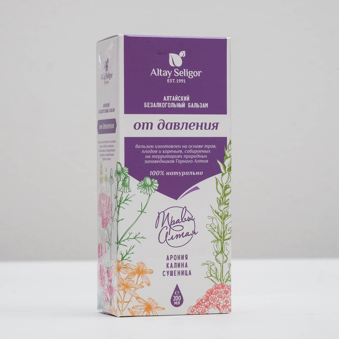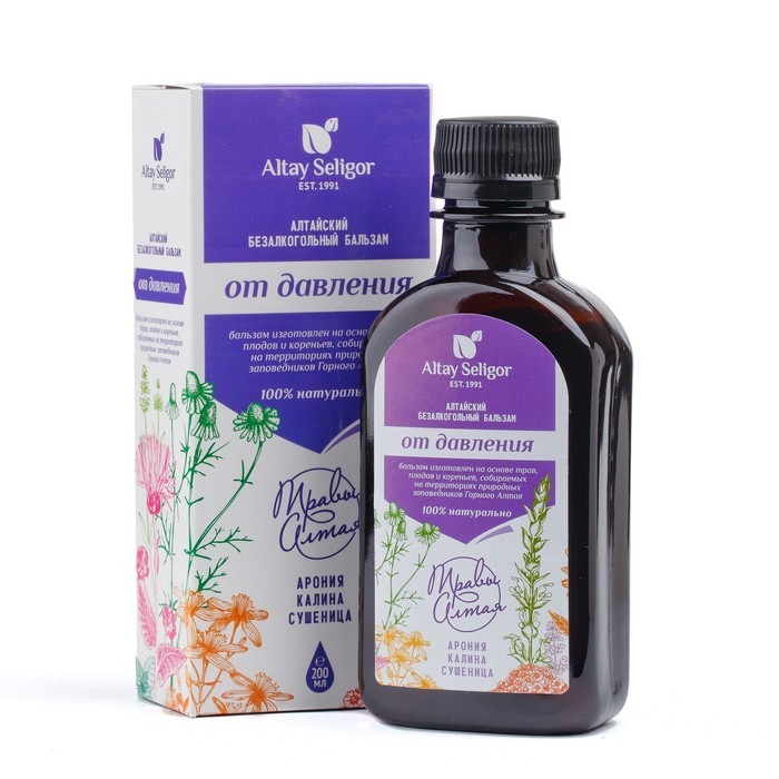 Алтайский бальзам на травах рекомендуется для нормализации давления. Средство производит мягкий гипотензивный эффект. Арония, калина, сушеница — активные действующие травы в бальзаме. Не содержит алко... Показать описаниеголя, можно применять каждый день. Травяной сбор укрепляет сердечную мышцу и стенки кровеносных сосудов, нормализует сердечный ритм. При постоянном применении бальзама укрепляется иммунитет, улучшается состояние сердечно-сосудистой системы в целом. Состав: сахар-песок, вода питьевая, плоды рябины черноплодной (аронии), плоды калины, плоды боярышника, листья мяты, трава пустырника, трава сушеницы, цветки календулы, трава клевера, плоды рябины, трава чабреца, регулятор кислотности (лимонная кислота). Рекомендации по применению: добавляйте по 1–2 чайной ложки на стакан воды, чая, сока, минеральной воды, молока, другого напитка или употребляйте в чистом виде 2–3 раза в день. Условия хранения: держите в сухом, защищённом от света месте при температуре не выше 25 °C. Срок годности: 24 месяца. Объём: 200 мл. Не является лекарством.