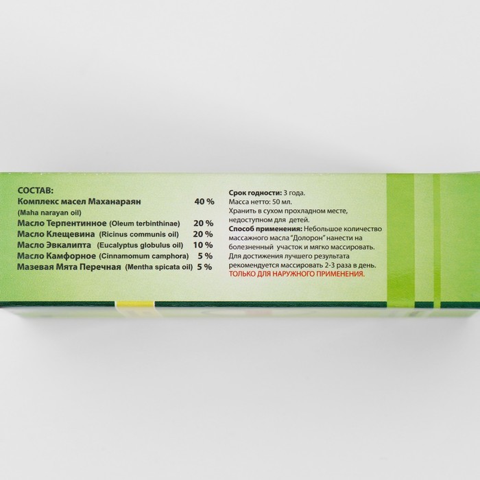 Аюрведическое масло Долорон помогает при воспалениях и болях в суставах уже после нескольких применений. Оно воздействует непосредственно на причину болевых ощущений, обладает сильным противовоспалите... Показать описаниельным и оздоравливающим воздействием, при массаже быстро впитывается и активно воздействует на мышечные и суставные ткани. Основные компоненты: * Масло Маханараяна (40%) - формула известного аюрведического целебного масла, применяется при всех типах ревматических проблем, для обеспечения легкости и подвижности суставов и поддержания их в нормальном состоянии. Эффективно при общей усталости, согревает, нормализует кровообращение, является иммуномодулятором. * Масло эвкалипта (10%) - это сильное обезболивающее с жаропонижающим и приятным охлаждающим эффектом. Это противовоспалительный, спазмолитический, антисептический, противоотёчный и дезодорирующий компонент. Незаменимо при ревматизмах, артритах, мышечных болях и растяжении связок, помогает наладить кровообращение. Содержит флавоноиды, альдегиды, ?- и ?-пинены, терпинен, дубильные вещества и органические кислоты. * Камфорное масло (5%) - обладает обезболивающим и противововоспалительным свойствами. Помогает при лечении лихорадки, ревматизма, артрита и растяжений. * Масло мяты перечной (5%) - регулирует окислительные процессы в тканях, улучшает кровообращение, обеспечивая питание суставов и костей, расширяет кровеносные сосуды, снижает болевой синдром, также оказывает успокаивающее действие. * Масло клещевины (20%) благотворно влияет на опорно-двигательный аппарат и суставы, снимая боль и воспаления. Повышает подвижность суставов, предотвращает отложение солей. Обладает бактерицидными свойствами и положительное влияет на кожу. * Терпентинное масло (20%) помогает при ревматических болях и невралгиях. Является хорошим местным сосудорасширяющим средством. Анальгетик, обладает противововоспалительным свойством. Способ применения: 1. Небольшое количество масла от боли в суставах Долорон нанести на болезненный участок. 2. Мягкими массажными движениями растереть масло. 3. Для достижения лучшего результата рекомендуется массировать 2-3 раза в день. Использовать исключительно наружно. Хранить в сухом прохладном месте недоступном для детей Противопоказания: индивидуальная непереносимость ингредиентов масла. Срок годности: 5 лет.