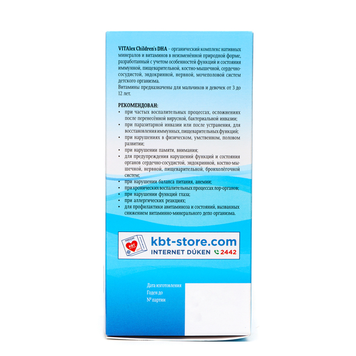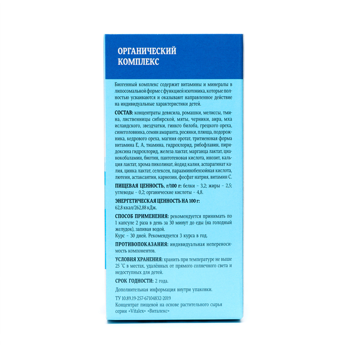 ВИТАЛЕКС ДЛЯ ДЕТЕЙ -органический комплекс нативных минералов и витаминов в неизмененной природной форме, разработанный с учетом особенностей функций и состояния иммунной, пищеварительной. костно-мыш... Показать описаниеечной, сердечно-сосудистой, эндокринной, нервной, мочеполовой систем детского организма. Витамины предназначены для мальчиков и девочек от 3 до 12 лет. Биогенный комплекс содержит витамины и минералы в липосомальной форме с функцией изотоника, которые полностью усваиваются и оказывают направленное действие на индивидуальные характеристики детей. Рекомендован: * при нарушении сопротивляемости организма вирусным, инфекционным процессам, при частых воспалительных процессах, осложнениях после перенесенной вирусной, бактериальной инвазии; * при паразитарной инвазии или после устранения, для восстановления иммунных, пищеварительных функций; * при нарушении в физическом, умственном, половом развитии; * при отставании в росте; * при нарушении памяти, внимания; * при повышенных умственных, физических нагрузках; * при смене климата; * для предупреждения нарушений функций и состояния органов сердечно-сосудистой, эндокринной, костно-мышечной, нервной, пищеварительной, бронхолегочной систем; * при нарушении баланса питания; * при анемии; * при хронических воспалительных процессах лор-органов; * после перенесенных заболеваний; * при нарушении массы тела; * при вегетососудистых нарушениях; * при нарушении функций глаза; * при аллергических реакциях; * при нарушении состояния кожи; * при психоэмоциональной лабильности; * для восстановления витаминно-минерального баланса и регуляции обменных процессов; * для профилактики авитаминоза и состояний, вызванных снижением витаминно-минерального депо организма; * при хронической усталости; * при гипоксии; * для предупреждения патогенных клеточных процессов. Состав: концентраты девясила, ромашки, мелиссы, тмина, лиственницы сибирской, мяты, черники, аира, мха исландского, звездчатки, гинкго билоба, грецкого ореха, синеголовника, семян амаранта, росянки, плюща, подорожника, кедрового ореха, магния оротат, тритиеновая форма витамина Е, А, тиамина гидрохлорид, рибофлавин, пиридоксина гидрохлорид, железа лактат, марганца лактат, цианокобаламин, биотин, пантотеновая кислота, инозит, кальция лактат, хрома пиколинат, йодид калия, аспарагинат калия, цинка лактат, селексен, парааминобензойная кислота, лютеин, астаксантин, карнозин, фосфат натрия, витамин С. Применение: рекомендуется принимать по 1 капсуле 2 раза в день за 30 минут до еды (на голодный желудок), запивая водой. Курс — 30 дней. Рекомендуется 3 курса в год. Органический нативный комплекс витаминов и минералов обладает высокой степенью биодоступности. Не содержит лекарственных, генномодифици- рованных веществ, гормонов, консервантов. Не вызывает привыкания. Рекомендуется для предупреждения авитаминозных состояний. Противопоказания: возможна индивидуальная непереносимость компонентов. Хранение: хранить температуре не выше 25°С в местах, удаленных от прямого солнечного света и недоступных для детей. Срок годность: 2 года.