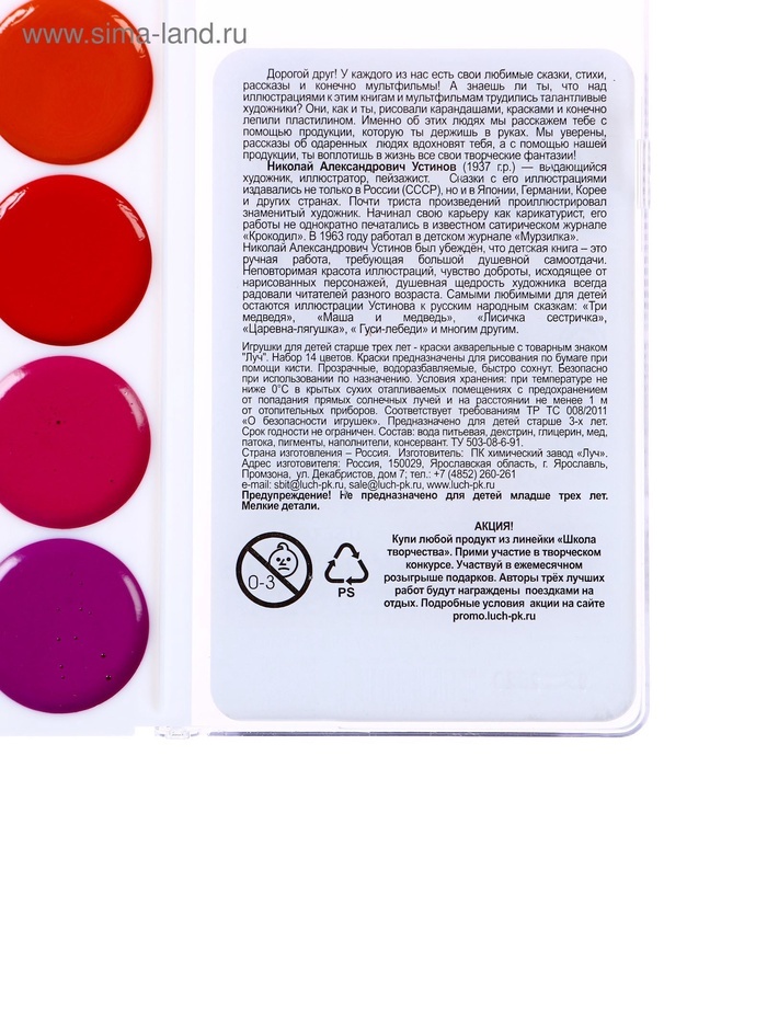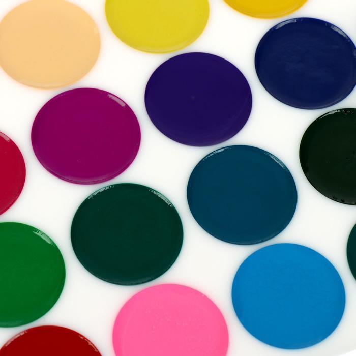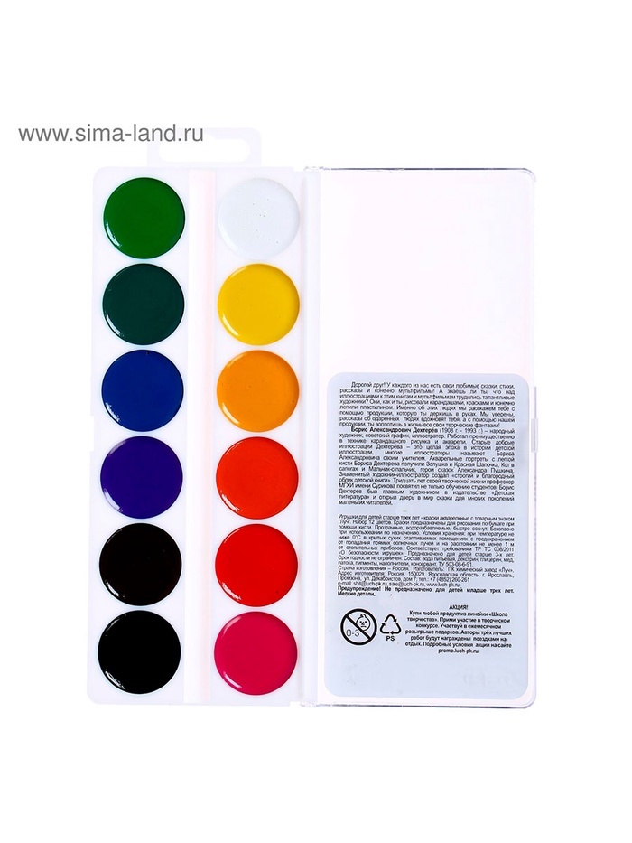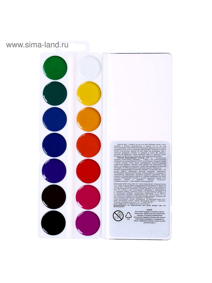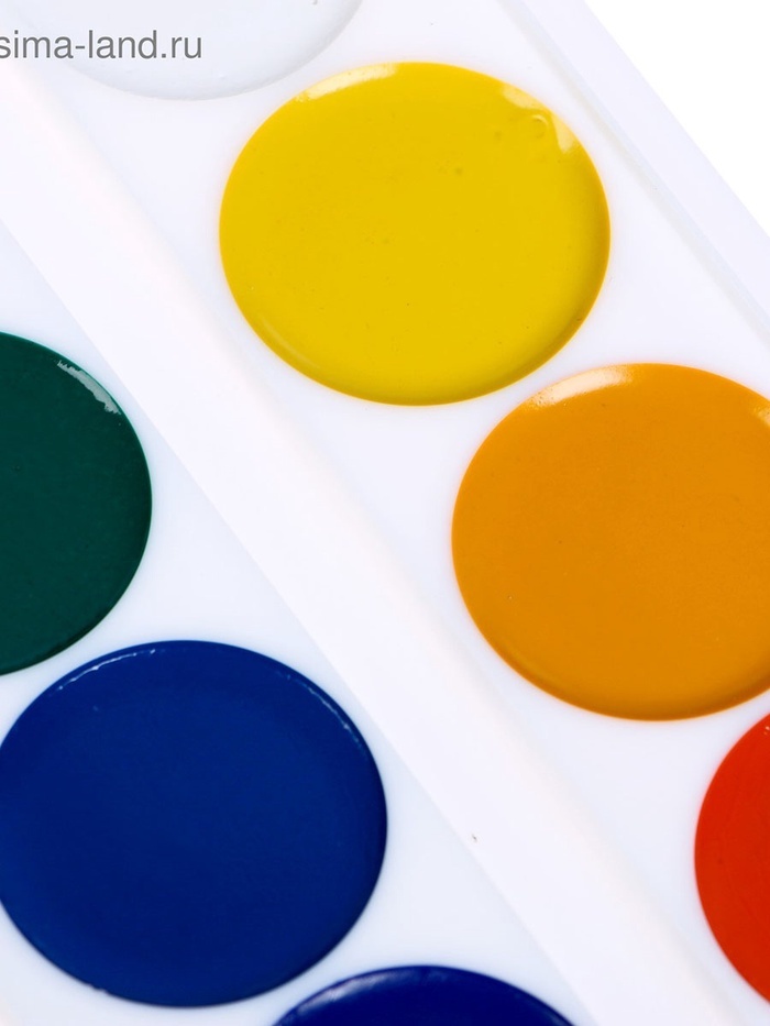 Высококачественная краска для детского творчества с яркими и чистыми цветами, изготовленная по классической рецептуре с использованием мёда. Прекрасно размывается и разносится по поверхности бумаги. К... Показать описаниераски смешиваются между собой, сохраняя насыщенность цвета. Краска легко смывается с рук и одежды Акварель - водорастворимая краска, поэтому высыхание (пузырьки, трещины) краски в кювете - не считается браком