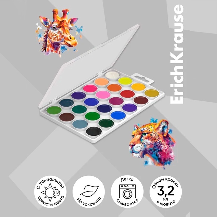 Акварельные краски ErichKrause с УФ защитой яркости. Актуальные цвета с яркой палитрой легко смешиваются и сочетаются между собой, равномерно ложатся на бумагу, обладают улучшенной цветопередачей и не... Показать описание выгорают на солнце благодаря УФ защите. Яркий эксклюзивный авторский дизайн выполнен в акварельной технике и нанесен на упаковку по технологии термопечати, не имеющей аналогов в России среди других производителей красок. Эта технология дает уверенность в оригинальности товара и защищает от подделок. * Коллекция: “Safari” * Количество цветов: 24 * Смываемость: easy washable * На водной основе: да * УФ-фильтр: да * Наличие кисти: нет Акварель - водорастворимая краска, поэтому высыхание (пузырьки, трещины) краски в кювете - не считается браком