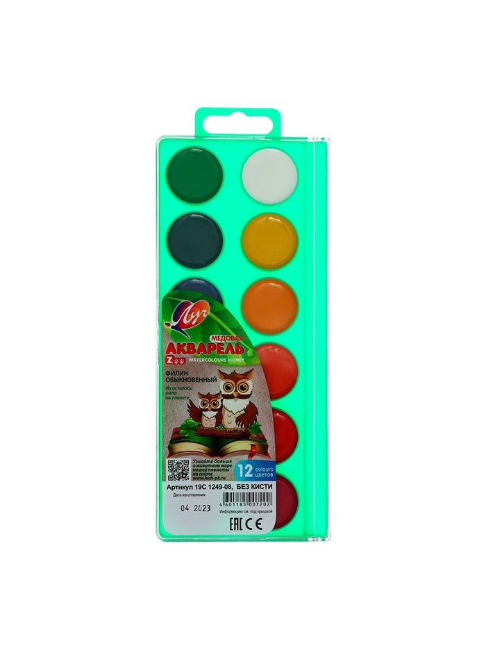 В составе набора медовой акварели 12 базовых цветов и 12 дополнительных. Набор выпускается в пластиковом пенале небольшого размера, что позволяет значительно экономить место в рюкзаке. Крышку упаковки... Показать описание можно использовать в качестве палитры. Поскольку производителем является признанный лидер в производстве профессиональных художественных материалов, акварельные краски "Я-Художник!" отличаются высокой чистотой цвета и яркостью. Даже при нанесении тонкого слоя краски цвет рисунка получается ярким, и что особенно важно для детей – не меняет свой цвет после высыхания. Краски легко набираются на влажную кисть и легко разносятся, ровно ложатся на бумагу. Тонкость перетира пигмента обеспечивает нанесение краски без образования точек и пятен. После высыхания краски не растрескиваются вне зависимости от толщины нанесенного слоя. Состав набора: белая, желтая, оранжевая, алая, розовая, зеленая, изумрудная, синяя, фиолетовая, охра, коричневая, черная; перламутровая: желтая, красная, зеленая, бирюзовая, синяя, черная; флуоресцентная: лимонная, красная, оранжевая, зеленая светлая, лиловая, голубая. Акварель - водорастворимая краска, поэтому высыхание (пузырьки, трещины) краски в кювете - не считается браком