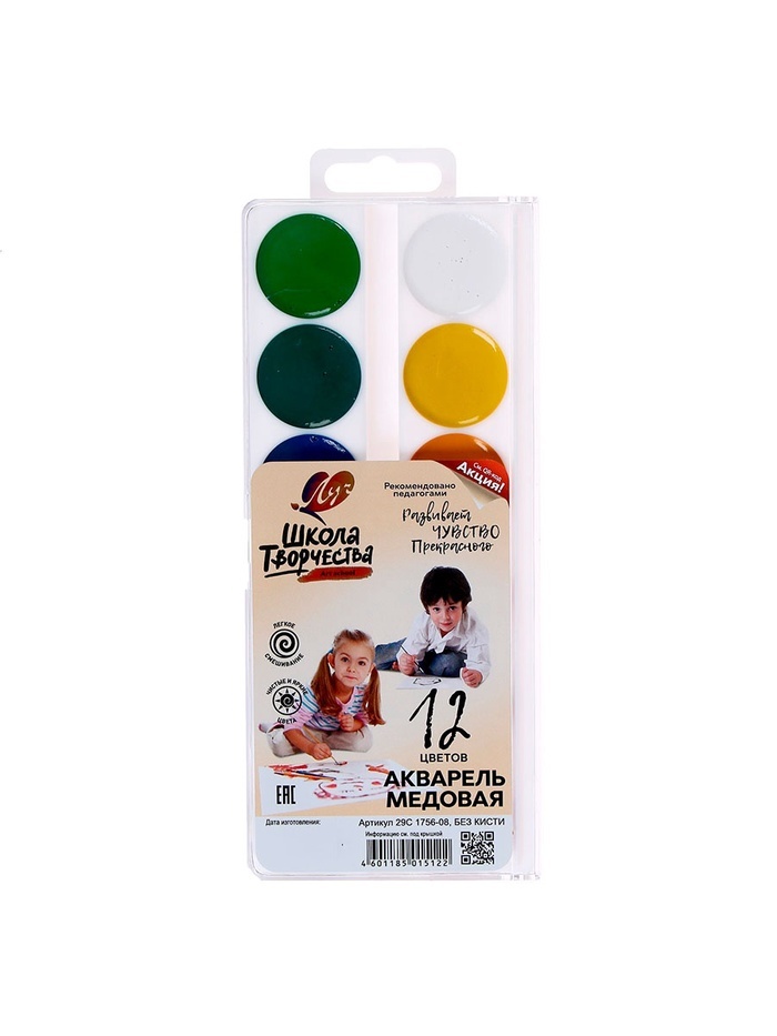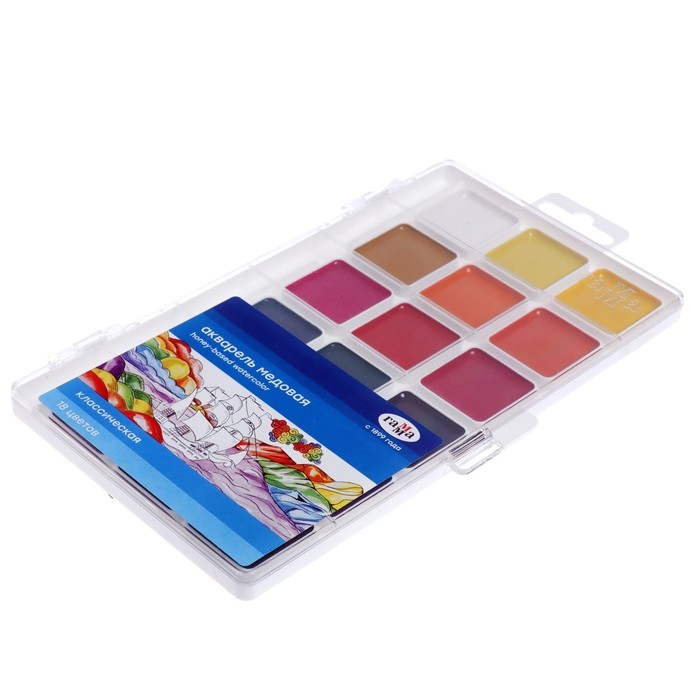 Медовая акварель детей от 7 лет, которые уже чувствуют себя взрослыми и хотят сами выбирать материалы для творчества. Благодаря качественному прозрачному связующему цвета акварели яркие, чистые и насы... Показать описаниещенные. Краски расположены на одной подложке, как на палитре настоящего художника. Акварель - водорастворимая краска, поэтому высыхание (пузырьки, трещины) краски в кювете - не считается браком
