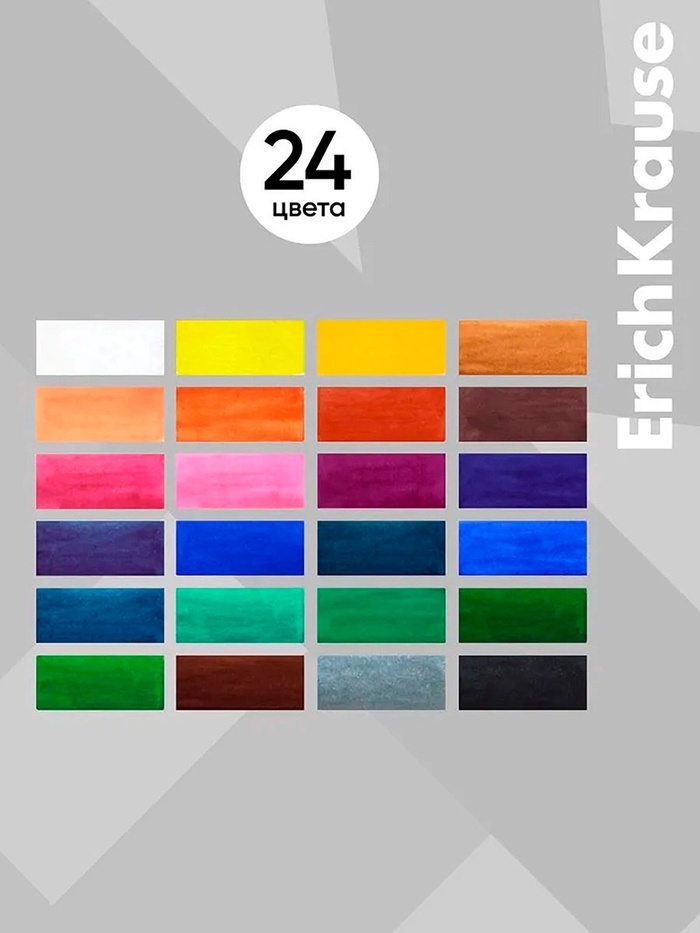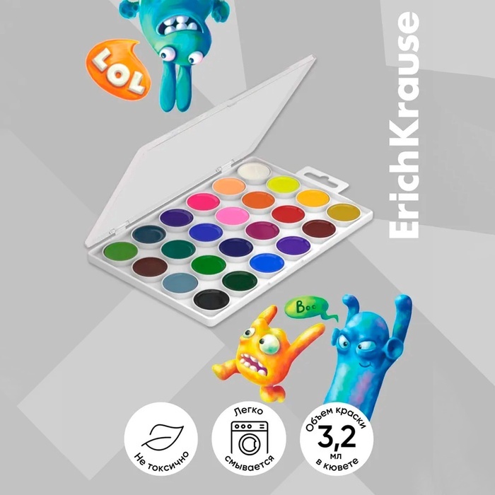 Акварельные краски ErichKrause – оптимальный выбор для школьного рюкзака. Новая уникальная формула акварели позволяет краске значительно легче разводиться водой, хорошо удерживаться кистью и равномерн... Показать описаниео ложиться на бумагу, создавая мягкие переходы цвета. По мере высыхания акварельный рисунок приобретает матовый насыщенный оттенок без посторонних бликов и затеков. Краска наиболее точно передает игру цвета и света на рисунке, создает цветовые комбинации. Для работы с акварелью лучший эффект достигается при использовании акварельной бумаги ErichKrause. Характеристики * Коллекция: «Jolly Friends» * Количество цветов: 24 * Смываемость: easy washable / повышенная * На водной основе: да * УФ-фильтр: нет * Наличие кисти: нет * Возраст: 3+ Трещина на акварели не является браком. Акварель трескается из-за испарения воды, которая была в составе краски. Чтобы восстановить рабочие свойства краски, необходимо восполнить нехватку жидкости