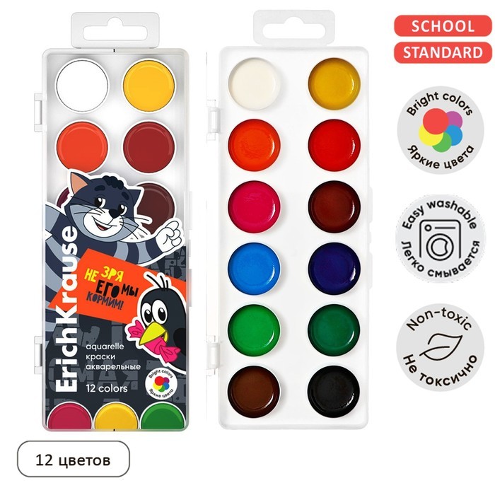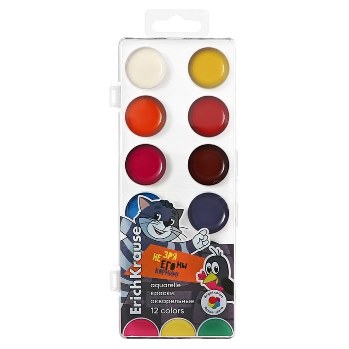 Акварель ErichKrause «Простоквашино», 12 цветов, без кисти, пластиковая коробка, европодвесВопросы по товару