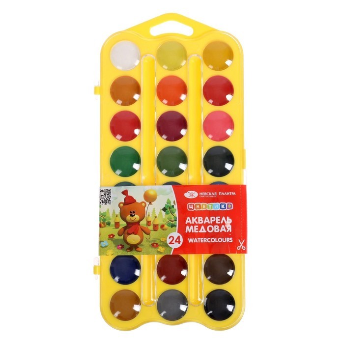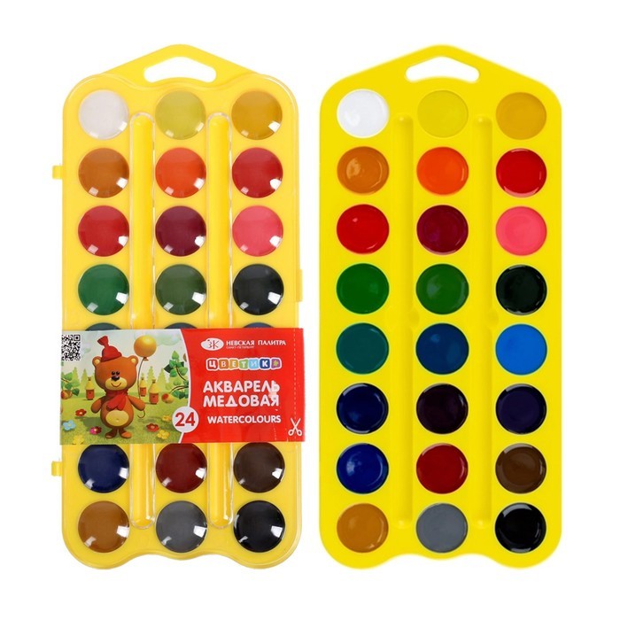 Акварель медовая «ЗХК. Цветик», 24 цвета, без кисти, жёлтый пластиковый футляр с петлёй, 27421678Вопросы по товару