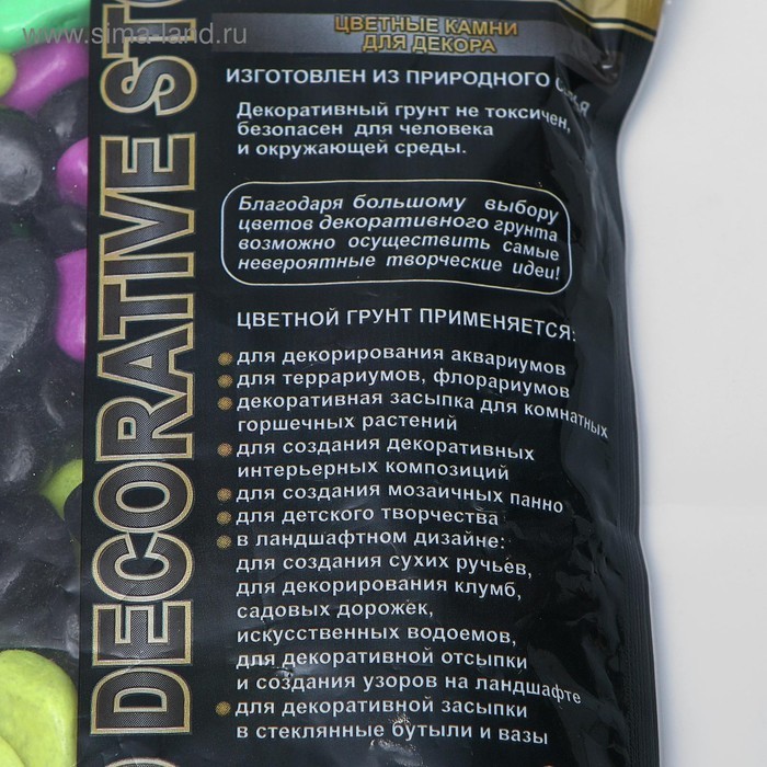 Декоративный грунт изготовлен из природного сырья, не токсичен, безопасен для человека и окружающей среды. Грунт окрашен Цветной грунт применяется: • Для декорирования аквариумов; • Для террариумов, ф... Показать описаниелорариумов; • Декоративная засыпка для комнатных горшечных растений; • Для создания декоративных интерьерных композиций; • В ландшафтном дизайне: для создания сухих ручьев, для декорирования клумб и садовых дорожек, искусственных водоемов, для декоративной отсыпки и создания узоров на ландшафте; • Для декоративной засыпки в стеклянные бутыли и вазы. Какой грунт выбрать? Выбор основы вашего водного мира зависит от того, планируется ли высаживание водорослей: • Песок, кварц или галька диаметром до 1 см – оптимальное решение в резервуарах без растительности. Такую природную смесь необходимо выложить по дну слоем от 1,5 до 5 см. • Травникам или другим водоемам с живыми водорослями понадобятся базовая почва, а также питательная подложка под нее. Песок, гальку размером до 3-4 мм можно смело использовать как основу. Фракция: 8-12 мм. Масса нетто: 800 г.