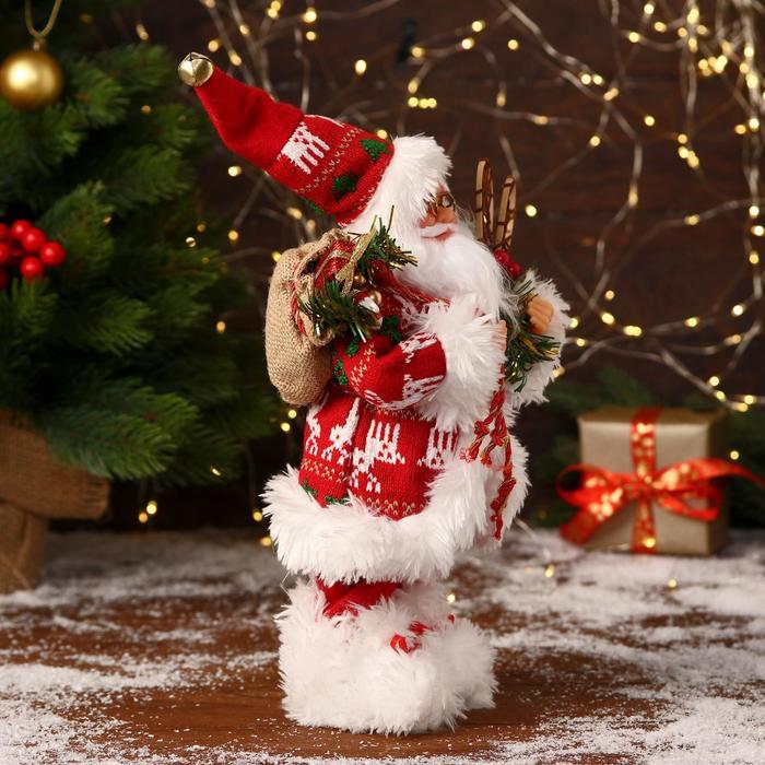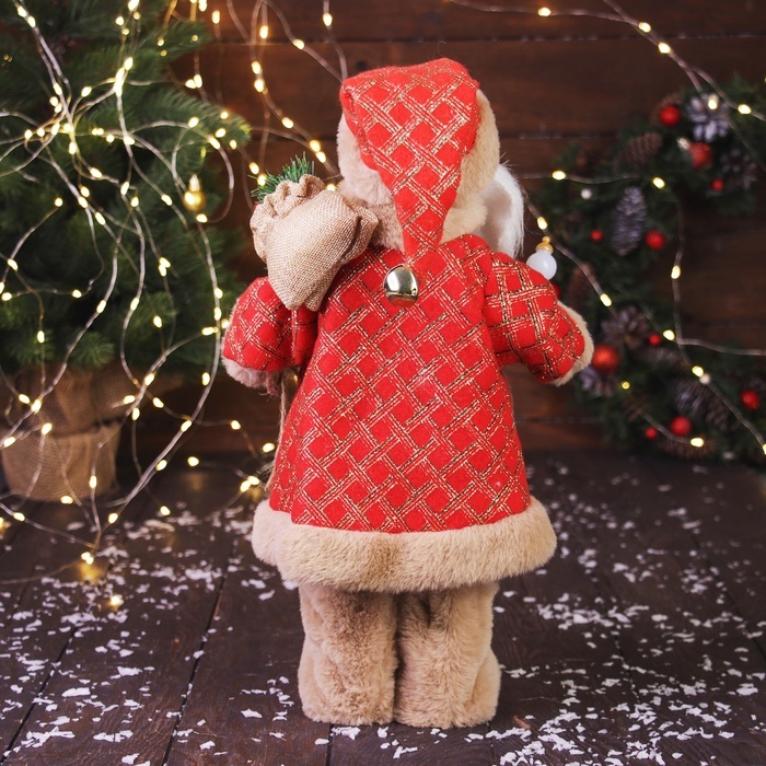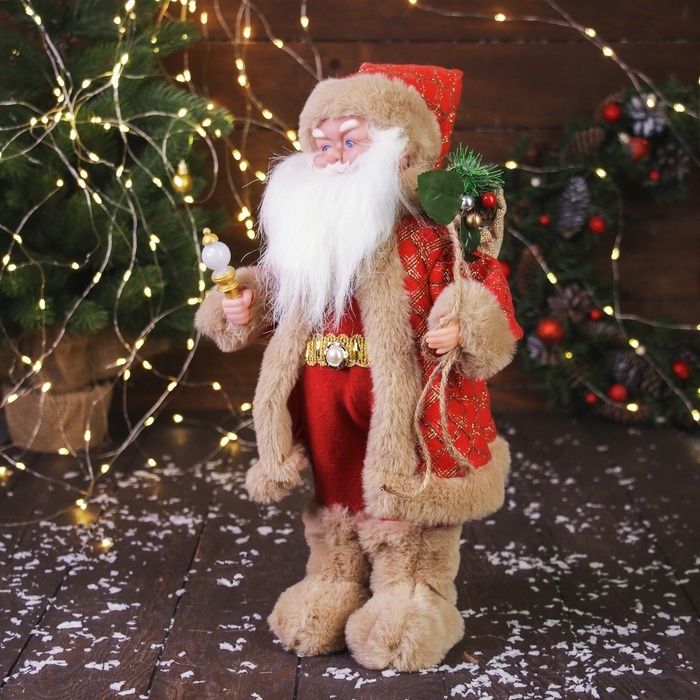 Дед Мороз под ёлку «Зимнее волшебство. В костюмчике с орнаментом, с посохом и подарками» двигается, 30 см Вопросы по товару