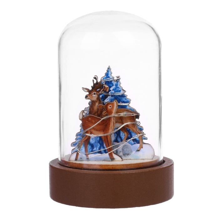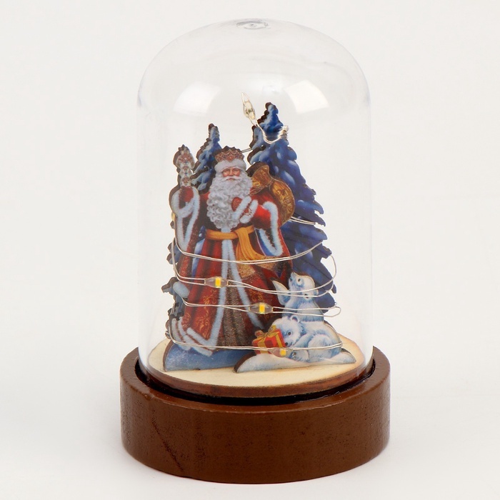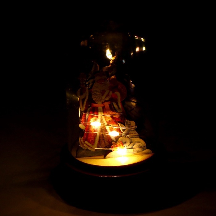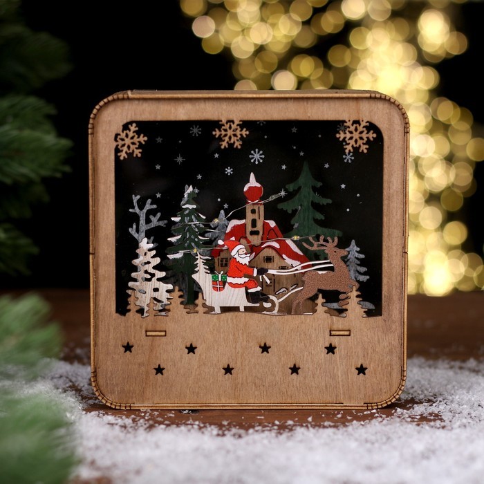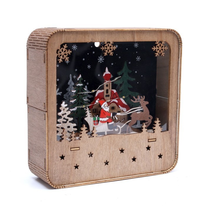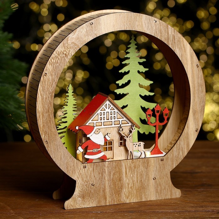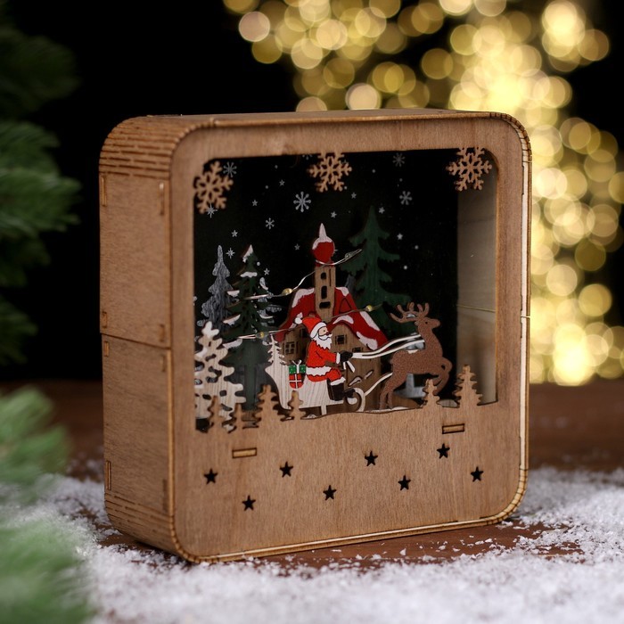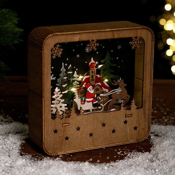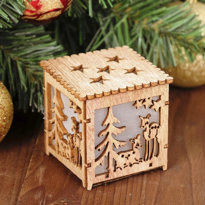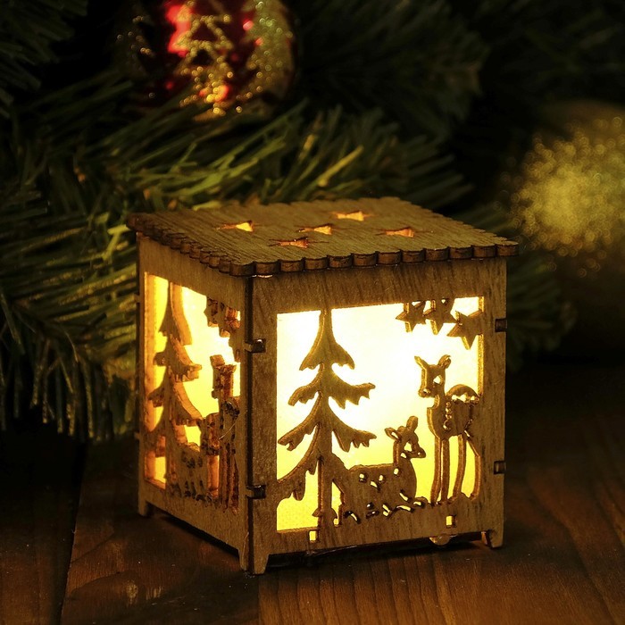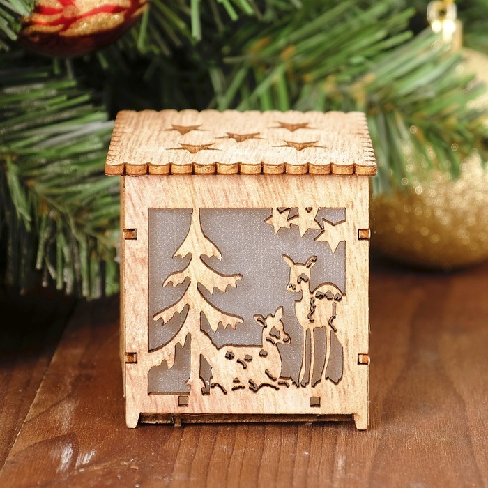 Светящийся декор отлично впишется в домашний интерьер и наполнит ваше жилище уютом и новогодней атмосферой. Особенности изделия: * Капсула выполнена из пластика, а значит ее сложно разбить или поранит... Показать описаниеься. * Основа выполнена из экологически чистого материала - дерева, поэтому крепкая и долговечная. * В светильник встроено 5 светодиодов, которые работают от батареек. * Размер светильника - 5,5 см х 5,5 см х 8,5 см.