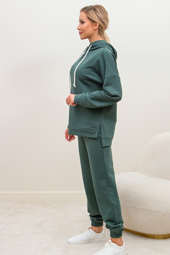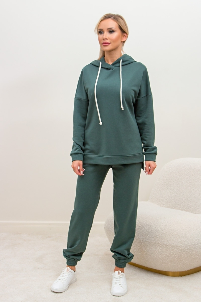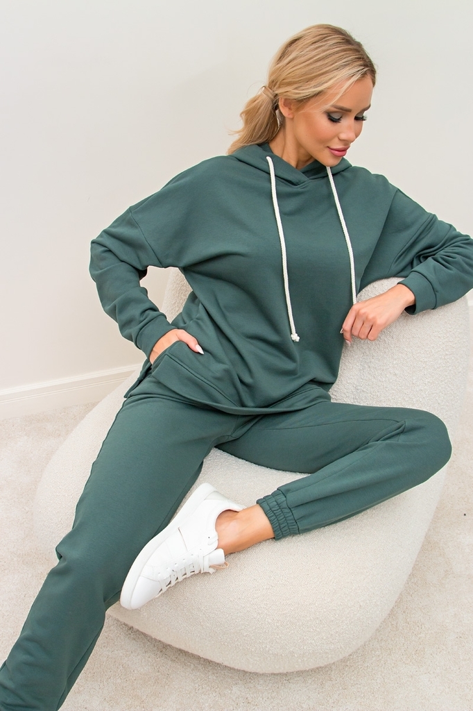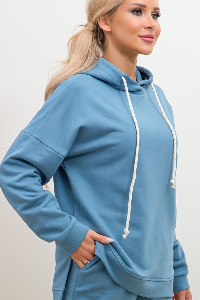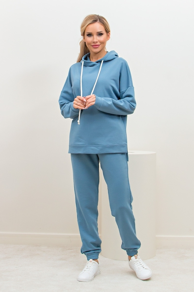 Стильный костюм из трикотажного полотна - футер. Состоит из толстовки и брюк. Толстовка свободного кроя со спущенным плечом. Длинный рукав со спущенным плечом, оканчивается притачной манжетой. Модель ... Показать описаниес капюшоном. Низ ассиметричный, оформление манжетой, по бокам разрезы. Брюки с комфортной посадкой на талии, которую обеспечивает пояс на резинке. Брючины оканчиваются широкими манжетами на резинке. Модель имеет функциональные карманы в боковых швах. Идеальный вариант для спорта и отдыха. Рекомендуемая стирка при t не более 30°. Длина изделия по переду: 42, 44, 46, 48 р - 64 см; 50, 52 р - 65 см ОГ : 42 р - 118 см; 44 р - 120 см; 46 р - 122 см; 48 р - 124 см; 50 р - 126 см; 52 р - 128 см Длина рукава от горловины: 42, 44, 46, 48 р - 75 см; 50, 52 р - 76 см Длина брюк по боковому шву: 42, 44, 46, 48 р - 100 см; 50, 52 р - 101 см Длина брюк по шаговому шву: 75 см ОТ: 42 р - 72 см; 44 р - 74 см; 46 р - 76 см; 48 р - 78 см; 50 р - 80 см; 52 р - 82 см ОБ: 42 р - 102 см; 44 р - 104 см; 46 р - 106 см; 48 р - 108 см; 50 р - 110 см; 52 р - 112 см Рост фотомодели: 168 см Размер фотомодели: 42 Ткань: Турецкий трикотаж футер - двухнитка (пенье)