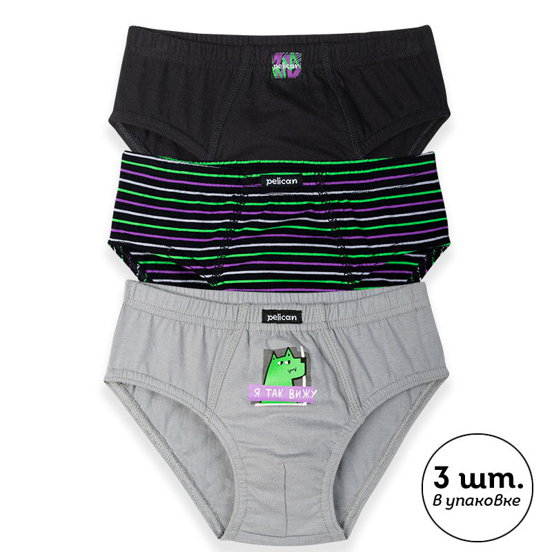 Состав: низ: 100%хлопок, низ2: 100%хлопок, низ:3 100%хлопокОписание: Выбирая бельё для своего ребёнка, любая мама заботится о его качестве и о том, чтобы ребёнку было удобно. Комплект трусов для мальч... Показать описаниеика (3 шт.) полностью соответствует этим запросам. В составе ткани 100% хлопка — трусы слипы приятны на ощупь, великолепно пропускают воздух, давая коже ребёнка дышать. Качественный натуральный материал и анатомически правильный крой гарантируют идеальную посадку на теле — ребёнку комфортно на протяжении всего дня. Мягкая широкая резинка в поясе исключает трение и дискомфорт. Трусы детские для мальчика представлены в трёх вариантах расцветки: чёрные в фиолетово-зелёную полоску, однотонные чёрные и серые с небольшим принтом в виде зелёной собаки и надписи "я так вижу" по переду. Принт мягкий и устойчивый, отлично переносит частые стирки. Трусы слипы для мальчика превосходно сочетаются с любой одеждой. В линейке представлены хлопковые трусы следующих размеров: 1 (86): 2 (92): 3 (98): 4 (104): 5 (110): 6 (116): 7 (122): 8 (128): 9 (134): 10 (140): 11 (146). Модель подходит малышам, мальчикам дошкольного возраста, младшего школьного возраста и мальчикам-подросткам. Отличный вариант детского белья для повседневной носки, спорта и отдыха. Модные трусы станут хорошим подарком сыну или внуку. Выбирайте нужный размер по таблице размеров на фото. Цвет товара на экране вашего устройства может отличаться от цвета изделия вживую. Товар возврату и обмену не подлежит.