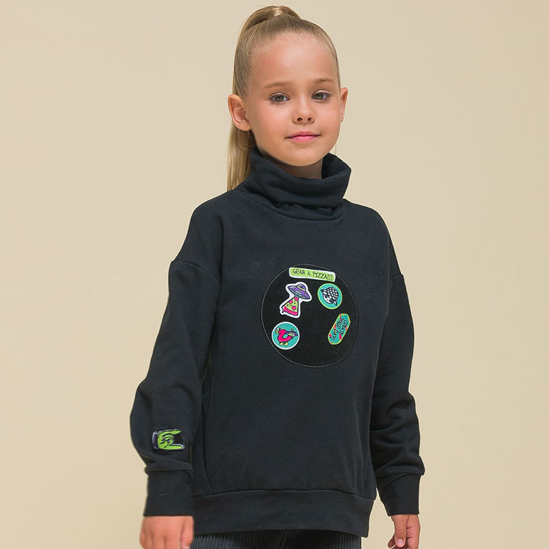 Состав: 95%хлопок 5%эластанОписание: Водолазка детская для девочки. Лонгслив модного оверсайз-силуэта со спущенным плечом подарит ребёнку комфорт и свободу движений. Джемпер с воротником-стойкой. Его ... Показать описаниеможно носить двумя способами: в два сложения — как у классической водолазки — и без отворота — актуально, стильно. По переду оригинальные рельефы, в которых прячутся карманы. По низу изделия пояс из основной ткани. На рукавах манжеты, также из основной ткани. На них есть отверстия для большого пальца — можно носить как митенки или как обычные манжеты. Модель неприхотлива в уходе. В составе ткани (футер с начёсом) преобладает качественный хлопок — джемпер мягкий и отлично пропускает воздух, давая коже ребёнка дышать. Эластан помогает изделию сохранить прекрасную форму надолго. Водолазка с оригинальным декором — «собери принт». Патчи на велькро (липучке) можно складывать в аппликации по своему желанию — такая необычная возможность творчества порадует ребёнка! В наборе несколько рисунков и надписей, надписи переводятся: «создай свой день!», «хватай пиццу!» Водолазка детская выполнена в классическом чёрном цвете, её легко сочетать с любыми брюками, джинсами, легинсами. Размерный ряд: 1 (86): 2 (92): 3 (98): 4 (104): 5 (110): 6 (116). Водолазка с принтом станет отличным дополнением гардероба для маленьких девочек дошкольного возраста. Её можно носить в детский сад, на прогулки, отдых, а также дома. Водолазка с длинным рукавом подходит для круглогодичного применения: летом, осенью, зимой, весной и демисезон. Отличный подарок дочери, внучке или сестре на Новый год и любой другой праздник.