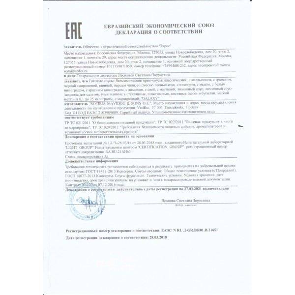 Дата изготовления: 05.05.2025 Срок годности: 04.11.2026 Горчица пикантная с оливковым маслом Papadimitriou в удобной упаковке. Состав: вода, бальзамический уксус, молотые семена горчицы, оливковое мас... Показать описаниело Экстра Вирджин (3,5%), СОЛЬ, мед, специи, стабилизатор Е415, Е412, пищевой краситель Е100, регулятор кислотности лимонная кислота, консервант Е202. Пищевая и энергетическая ценность на 100г продукта Энергетическая ценность 115 Ккал / 489 КДж Белки - 4.5 г, Углеводы - 7.7 г, из них сахар - 4.9 г, Жиры - 7.4 г, из них насыщенные - 1.0 г, Клетчатка - 2.5 г, Соль - 3,5 г. Кислотность 1.3%-1.9%. Продукт не содержит глютен и ГМО. Условия хранения: Закрытую упаковку хранить в прохладном и защищенном от солнечных лучей месте при температуре от +5 до +26 градусов Цельсия. Открытую упаковку хранить в холодильнике при температуре от +2 до +6 градусов Цельсия. Вес нетто: 300 г. Вес брутто: 331 г. Производитель: Papadimitriou C.C.S.A. Kalamata, Greece. Упаковка: пластиковая бутылка.