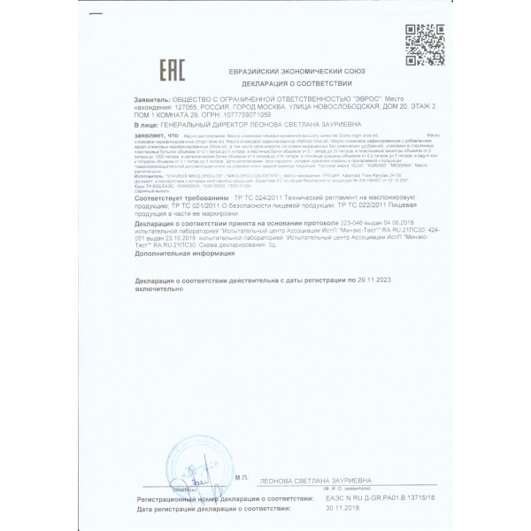 Дата изготовления: 16.06.2025 Срок годности: 16.06.2027 Оливковое масло первого холодного отжима из региона Акротири, серия "ПРАВОСЛАВНАЯ ГРЕЦИЯ". Урожай оливок собирается в крестьянских и монастырски... Показать описаниех хозяйствах полуострова Акротири в регионе Ханья на северо-западе Крита. Долгое время центрами хозяйственной жизни полуострова выступали православные монастыри Agia Triada (Святой Троицы), Gouverneto (Гувернето) и монастырь Святого Иоанна Затворника. В монастырях и прилежащих хозяйствах  бережно хранились традиции переработки  свежих оливок в лечебное масло. И по сей день оливковое масло из Акротири отличается гармоничным сочетанием терпкости и мягкости. Состав: 100% оливковое масло первого холодного отжима (extra virgin). Масло отжато из оливок сорта Коронейки. Пищевая ценность в 100г продукта: Энергетическая ценность: 900 кКал/ 3700 КДж. Белки – 0 г; Углеводы – 0 г; Жиры - 100г. Из них: * насыщенных жиров 14 г, * мононенасыщенных жирных кислот 77 г, * полиненасыщенных жирных кислот 9 г. Соль - 0 г. Кислотность оливкового масло Akrotiri не превышает 0.5%. Условия хранения: Хранить в прохладном и темном месте. При низких температурах возможно помутнение. Для восстановления нормального состояния масла поместить его в условия комнатной температуры. Продукция соответствует требованиям ТР ТС 024/2011 от 09.12.2011. Объем : 250 мл. Вес брутто: 0.55 кг. Производитель: ELMAR CRETE AE, 57009, Kimitirion 5, Kalochori, Салоники, Греция.