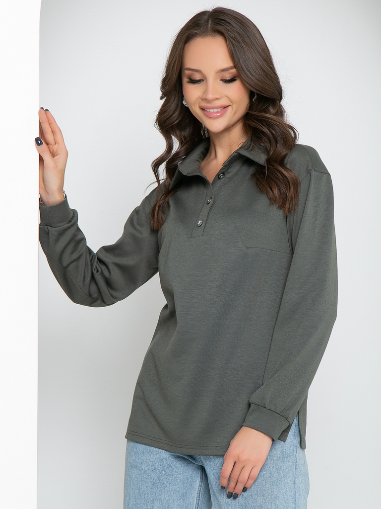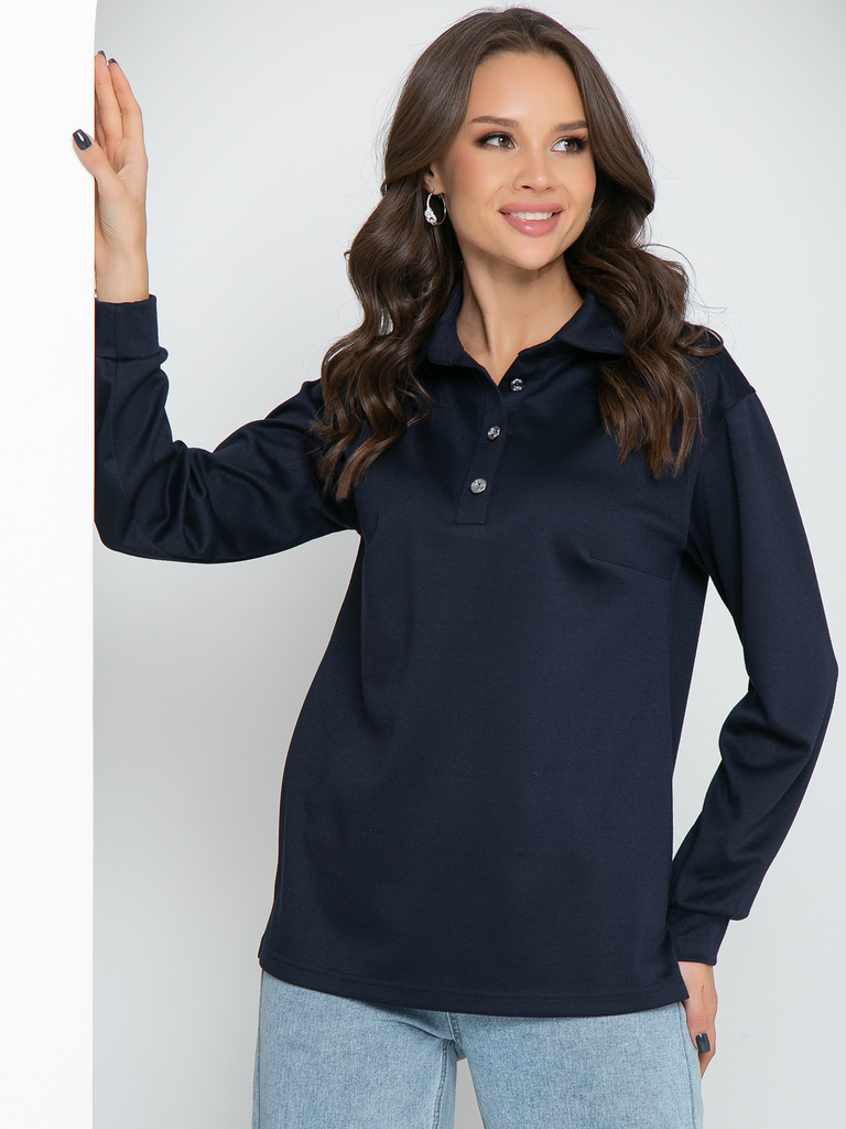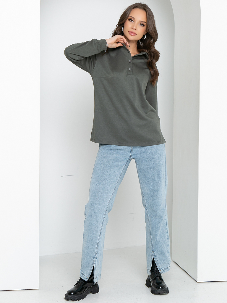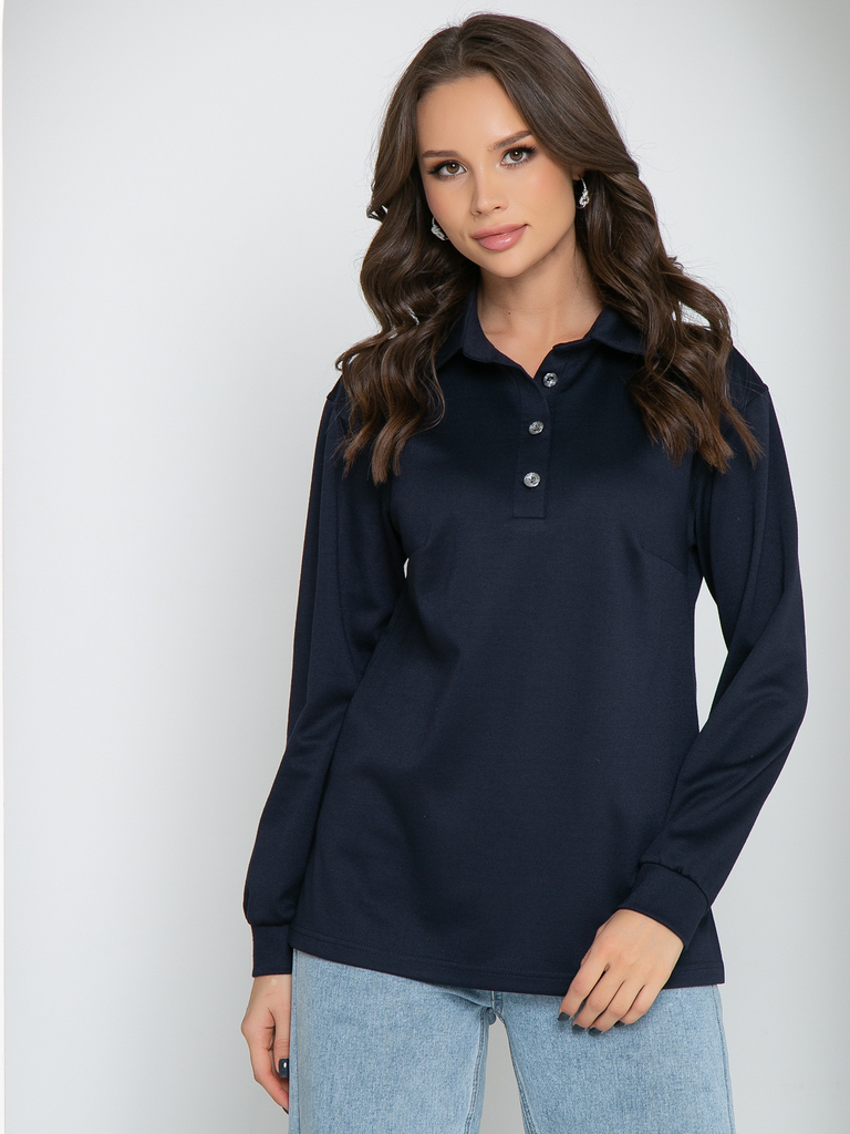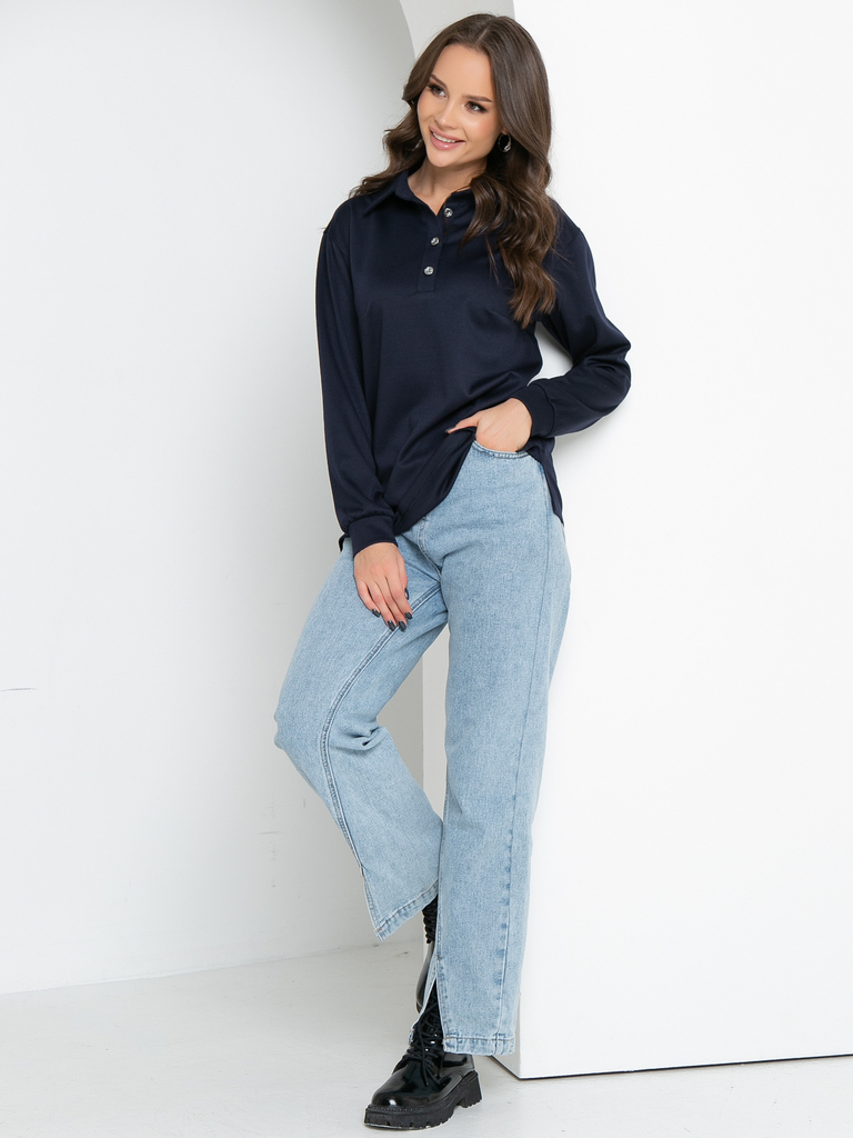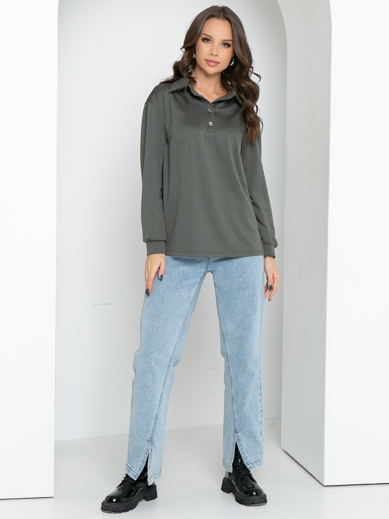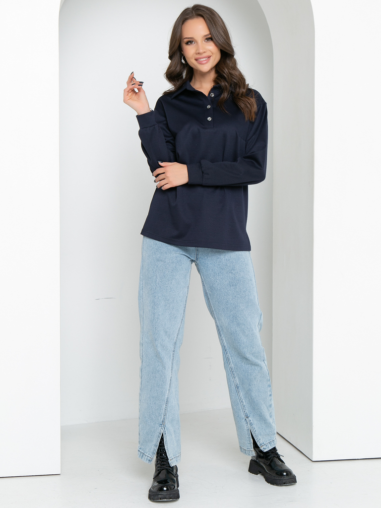Модель выполнена из трикотажного полотна Состав: 60% полиэстер, 35% вискоза, 5% эластан. Свободный трикотажный джемпер поло с длинным рукавом- удобная и стильная одежда на все сезоны. По горловине при... Показать описаниешит воротничок на стойке, спереди сделана планка с пуговичками. Рукав втачной, немного спущен, внизу на манжете. По боковым швам снизу сделаны разрезы Длина изделия: 44р- 67см, 46р-67,5см,48р-68см,50р-68,5см,52см-69см Длина рукава для всех размеров: 54см