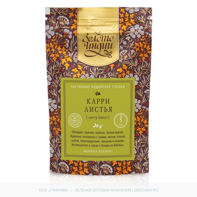 Это пряные листья кустарника Murraya koenigii. Внешне немного похожи на лавровые, имеют приятный аромат с оттенками шалфея, петрушки и красного перца, хорошо возбуждающий аппетит. Наименование "карри"... Показать описание принадлежит британцам: именно они назвали эти листья curry leaf, так как были убеждены, что индийские повара именно их кладут в свои секретные пряные смеси «карри». Индийцы называют эти листья «кари-патта», «кари-пхулиа», «митха-ним» или просто «ним» и часто обжаривают их в «ги» (топленом масле из молока буйволицы), пока они не станут хрустящими, а затем вынимают и используют масло, спитавшее чудесный аромат карри. Родина - Индия. Произрастает Мурайя в Юго-Западной Азии. Лечебные свойства Издавна ценится за свои лечебные свойства. Его кора и листья - едва ли не лучший в мире природный антисептик: ему нет равных по способности очищать кровь и удалять из организма вредные вещества и токсины. В Аюрведической медицине листья карри используют также для очищения кожи: особенно полезны они для людей с раздражительной и нежной кожей, склонной к шелушению и экземе. Листья карри помогают при энтероколите, гепатите, холецистите. Они хорошо вылечивают воспалительные процессы в почках, увеличивают диурез. Способствуют заживлению ран, лечению пневмонии, полиартритов, остеохондроза, воспаления мочевого пузыря. Они очищают кровь от инфекции белковых шлаков, лечат ангину, фурункулез кожи и другие бактериальные инфекции. Карри обладает укрепляющими, тонизирующими и антибактериальными свойствами. Этот продукт полезен при диарее, дизентерии, астме и кашле. В Аювердической медицине данную приправу применяют для очищения кожи и в качестве жаропонижающего и кровоостанавливающего средства. Свежие листья карри содержат эфирное масло, состав которого очень изменчив и зависит от области произрастания растения, но обычно листья содержат от 0,5 до 2,7% эфирного масла. Несмотря на отсутствие фактической медицинской документации, ароматерапевты используют эфирное масло листьев карри для лечения диабета, при выпадении волос, для очищения кожи. Особенно листья карри полезны для людей с раздражительной и нежной кожей, склонной к шелушению и экземе. Также листья карри очень помогают усвоению протеина злаков и бобов. Используют листья карри и в косметологии. Свежие листья, растертые до пастообразного состояния и смешанные с куркумой, представляют собой лечебную маску для лица, особенно при проблемной коже: ежедневное применение в течение двух недель – и от расширенных пор и угрей не останется и следа, только сияющая чистая кожа. Прокипятив листья в кокосовым масле, получают натуральную растительную краску для волос, кроторая не только закрашивает седину, но и укрепляет корни волос, стимулирует их рост. Великолепные длинные шелковистые волосы индийских женщин известны во всем мире. А секрет их прост: уже много веков после каждого мытья на них накладывают маску из пасты, сделанной из листьев карри, каркаде (Hibiscus sabdariffa) и пажитника (Trigonella foenum-graecum). В кулинарии листья карри используют главным образом в супах, горячих овощных блюдах и закусках. Они обладают тонким, «горячим» пряным ароматом, который «согревает» и обогащает вкусовой букет любого первого или второго горячего блюда. Листья карри немного похожи на лавровые листья, в свежесорванном виде о