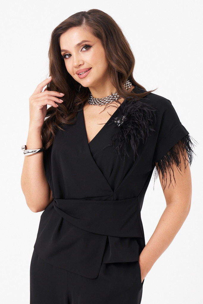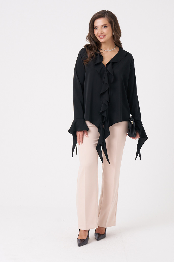 Описание Женская блузка выполнена из легкой и воздушной вискозной ткани что придает ей приятную мягкость и комфорт в носке. Её классический чёрный цвет делает универсальным, подходящим для повседневны... Показать описаниех ситуаций. Дизайн переда и спинки украшен двумя вертикальными рельефами, которые создают стройный силуэт и визуально удлиняют линию туловища. Внутри рельефов вставлены изящные воланы, добавляющие образу нотки романтики и женственности. Горловина V-образная обработана воланами, что придает мягкую изысканность и привлекательность. Длинные втачные рукава украшены воланами по линии проймы и вдоль рукава, создавая легкий объем и динамику движения. Такая отделка подчеркивает воздушность модели и делает ее особенно привлекательной. Эта блузка чёрного оттенка идеально подойдет для повседневных образов — она сочетает комфорт, стиль и женственность, позволяя выглядеть элегантно в любой ситуации. Параметры Рост: 164 44 Блузка: Длина изделия - 65см, Длина рукава - 60см, Ширина плеча - 12.6см, Ширина по груди - 51.5см, Ширина по низу - 55.5см, Ширина рукава - 18.9см; 46 Блузка: Длина изделия - 65см, Длина рукава - 60см, Ширина плеча - 12.8см, Ширина по груди - 53.5см, Ширина по низу - 57.5см, Ширина рукава - 19.7см; 48 Блузка: Длина изделия - 66см, Длина рукава - 60см, Ширина плеча - 13см, Ширина по груди - 55.5см, Ширина по низу - 59.5см, Ширина рукава - 20.5см; 50 Блузка: Длина изделия - 66см, Длина рукава - 60см, Ширина плеча - 13.2см, Ширина по груди - 57.5см, Ширина по низу - 61.5см, Ширина рукава - 21.3см; 52 Блузка: Длина изделия - 66см, Длина рукава - 60см, Ширина плеча - 13.4см, Ширина по груди - 59.5см, Ширина по низу - 63.5см, Ширина рукава - 22.1см; Состав и уход Состав: Вискоза/viscose 87%; полиэстер/polyester 13%. Уход: * Стирка при температуре воды до 30°C * Не отбеливать * Гладить при температуре утюга до 110°C * Вертикальная сушка * Барабанная сушка запрещена * Профессиональная сухая чистка в тетрахлорэтилене и во всех растворителях, внесенных в список для символа F.