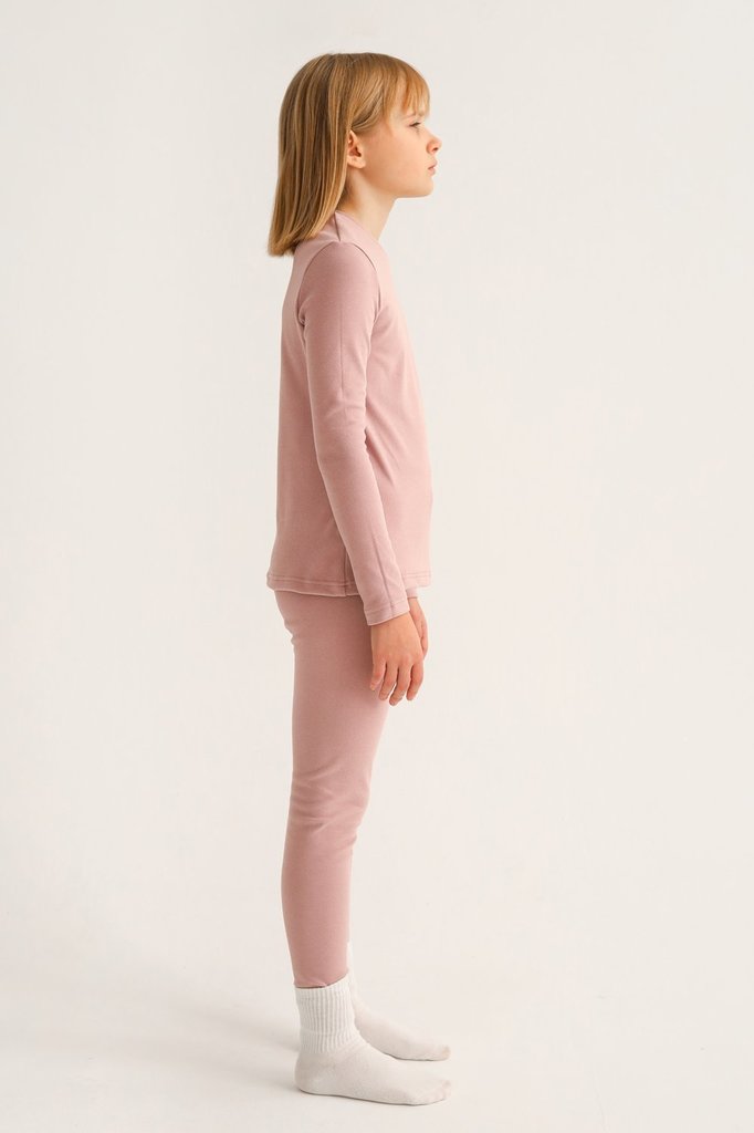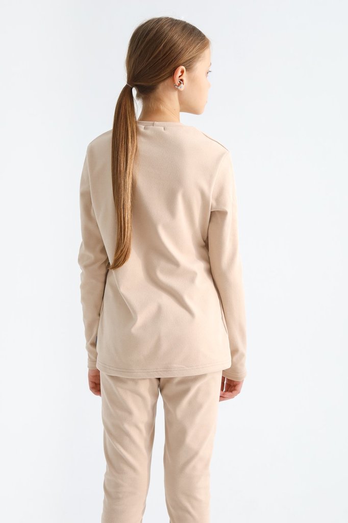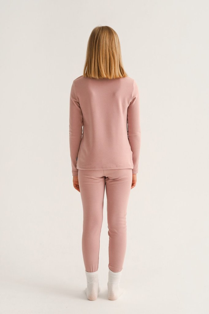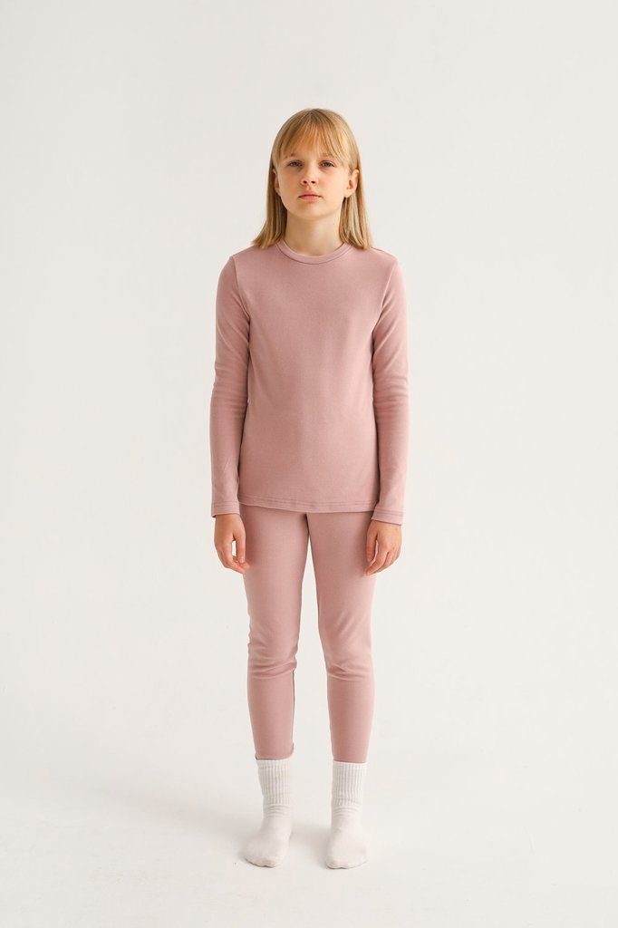 Нежная на ощупь ткань. Плотное облегание. Лонгслив с округлым вырезом горловины. Легинсы с поясом на резинке.