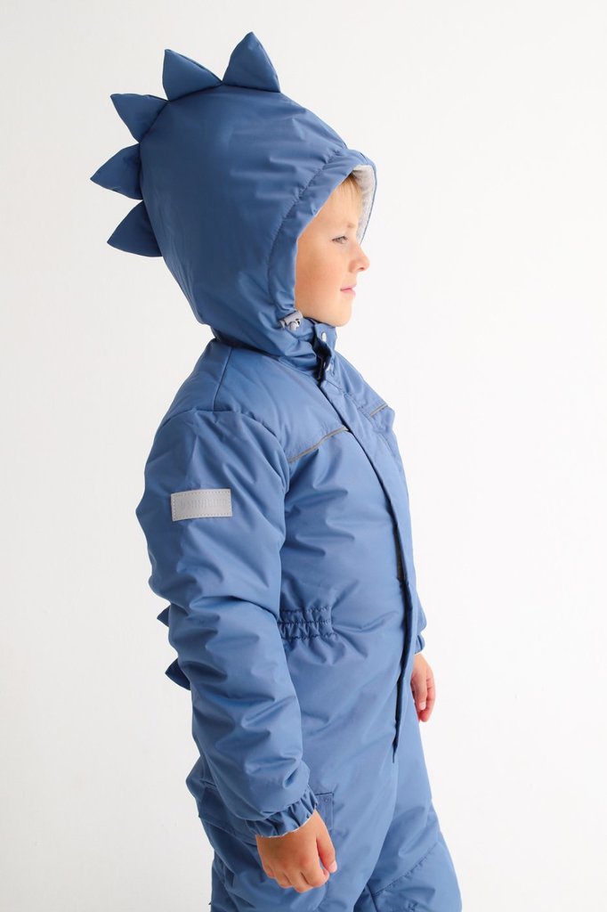 Комбинезон умеренного объема с застежкой на молнию. Капюшон с утяжкой на шнуровую резину. Световозвращающие элементы. Манжеты на штанинах с противоскользящей резиной плотно облегают обувь, эргономичны... Показать описаниее вытачки на коленях. Внутренние мягкие лямки из помочной резины, благодаря которым можно скидывать верхнюю часть комбинезона и носить в помещении по принципу рюкзака. Накладной карман на кнопках. Фирменные Дино-гребни на спине и капюшоне. Примерный температурный режим от -30°С до -5°С.