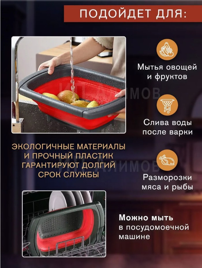 Дуршлаг складывается и тем самым экономит много места на кухне или в сумке при перевозке, но при этом достаточно объемный и вместительный в развернутом виде (объём 5 литра). Телескопические ручки... Показать описание выдвигаются и фиксируются на раковине. Складной дуршлаг изготовлен из экологически чистого силикона и пластика, не выделяет вредных веществ, выдерживает диапазон температур от -40 до +220 градусов, легко моется и даже подходит для посудомоечных машин. Не гремит, в отличии от металлических аналогов и его легко можно взять с собой на дачу или природу.