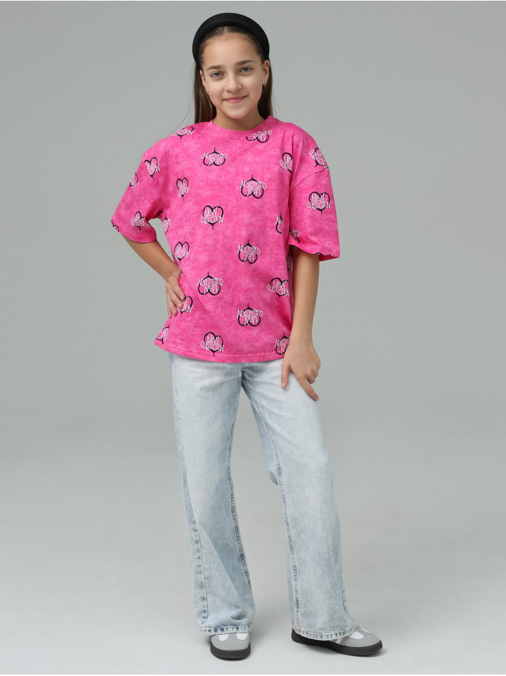 Краткое описание Стильная футболка для девочки с современным принтом в стиле оверсайз. Широкий размерный ряд охватывает разные возраста детей от дошкольников до школьников подростков или на возраст 6,... Показать описание 7, 8, 9, 10, 11, 12, 13 и 14 лет. Футболка  классического прямого кроя с короткими рукавами и круглым вырезом горловины. Детская футболка на каждый день на прогулку, дачу, в садик, для дома, в школу. Удобная длина позволяет носить футболку заправленной и навыпуск . Отлично сочетается с шортами, джинсами, брюками, юбками. Модная хлопковая футболка, материал приятен на ощупь, позволяет телу дышать, при бережном уходе не дает усадку и не деформируется. Принт яркий и долговечный, напечатан по современным технологиям гипоаллергенной безопасной для кожи краской. Отличный подарок для девочки на день рождения и без повода.