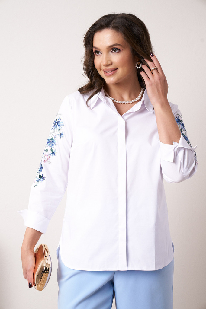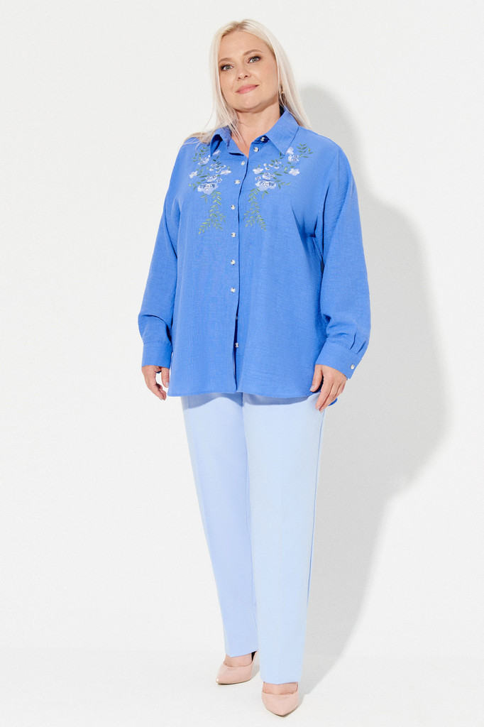 Описание Блуза из смесовой ткани для повседневной носки прямого силуэта. Застежка в блузке супатная на петли и пуговицы. Перед имеет нагрудные вытачки, низ слегка скруглен. Спинка с кокеткой. Горловин... Показать описаниеа обработана рубашечным воротником с отрезной стойкой. Рукава втачные с вышивкой в виде цветов, низ рукава обработан притачной манжетой с застежкой на две обметанные петли и две пуговицы. Длина изделия классическая. Элегантная и изысканная блузка станет вашим фаворитом для любого рода мероприятий. Параметры Рост: 164 42 Блузка: Длина изделия - 74см, Длина переда от высшей плечевой точки до низа - 75см, Длина рукава - 49см, Обхват шеи - 48см, Ширина плеча - 12см, Ширина по бедрам - 51см, Ширина по груди - 48.5см, Ширина рукава - 17см; 44 Блузка: Длина изделия - 74.5см, Длина переда от высшей плечевой точки до низа - 75.5см, Длина рукава - 49см, Обхват шеи - 49см, Ширина плеча - 12см, Ширина по бедрам - 53см, Ширина по груди - 50.5см, Ширина рукава - 17.8см; 46 Блузка: Длина изделия - 74.5см, Длина переда от высшей плечевой точки до низа - 75.5см, Длина рукава - 49см, Обхват шеи - 49.5см, Ширина плеча - 12.1см, Ширина по бедрам - 55см, Ширина по груди - 52.5см, Ширина рукава - 18.5см; 48 Блузка: Длина изделия - 74.5см, Длина переда от высшей плечевой точки до низа - 75.5см, Длина рукава - 49.5см, Обхват шеи - 50.5см, Ширина плеча - 12.3см, Ширина по бедрам - 57см, Ширина по груди - 54.5см, Ширина рукава - 19.3см; 50 Блузка: Длина изделия - 75.5см, Длина переда от высшей плечевой точки до низа - 76.5см, Длина рукава - 49.5см, Обхват шеи - 52.5см, Ширина плеча - 12.3см, Ширина по бедрам - 59см, Ширина по груди - 56.5см, Ширина рукава - 20см; 52 Блузка: Длина изделия - 75.5см, Длина переда от высшей плечевой точки до низа - 76.5см, Длина рукава - 49.5см, Обхват шеи - 53.5см, Ширина плеча - 12.5см, Ширина по бедрам - 61см, Ширина по груди - 58.5см, Ширина рукава - 20.8см; 54 Блузка: Длина изделия - 75.5см, Длина переда от высшей плечевой точки до низа - 76.5см, Длина рукава - 49.5см, Обхват шеи - 54см, Ширина плеча - 12.5см, Ширина по бедрам - 63см, Ширина по груди - 60.5см, Ширина рукава - 21.5см; 56 Блузка: Длина изделия - 75.5см, Длина переда от высшей плечевой точки до низа - 76.5см, Длина рукава - 49.3см, Обхват шеи - 55см, Ширина плеча - 12.5см, Ширина по бедрам - 65см, Ширина по груди - 62.5см, Ширина рукава - 22.2см; 58 Блузка: Длина изделия - 75.5см, Длина переда от высшей плечевой точки до низа - 76.5см, Длина рукава - 49.5см, Обхват шеи - 56см, Ширина плеча - 12.7см, Ширина по бедрам - 67см, Ширина по груди - 64.5см, Ширина рукава - 23см; 60 Блузка: Длина изделия - 76см, Длина переда от высшей плечевой точки до низа - 77см, Длина рукава - 49.5см, Обхват шеи - 56.5см, Ширина плеча - 12.7см, Ширина по бедрам - 69см, Ширина по груди - 66.5см, Ширина рукава - 23.7см; 62 Блузка: Длина изделия - 76см, Длина переда от высшей плечевой точки до низа - 77см, Длина рукава - 49.5см, Обхват шеи - 57см, Ширина плеча - 13см, Ширина по бедрам - 71см, Ширина по груди - 68.5см, Ширина рукава - 24.5см; Состав и уход Состав: Хлопок 76%; полиэстер 22%; эластан 2%. Уход: * Стирка при температуре воды до 30°C * Не отбеливать * Гладить при температуре утюга до 110°C * Вертикальная сушка * Барабанная сушка запрещена * Профессиональная сухая чистка в тетрахлорэтилене и во всех растворителях, внесенных в список для символа F.