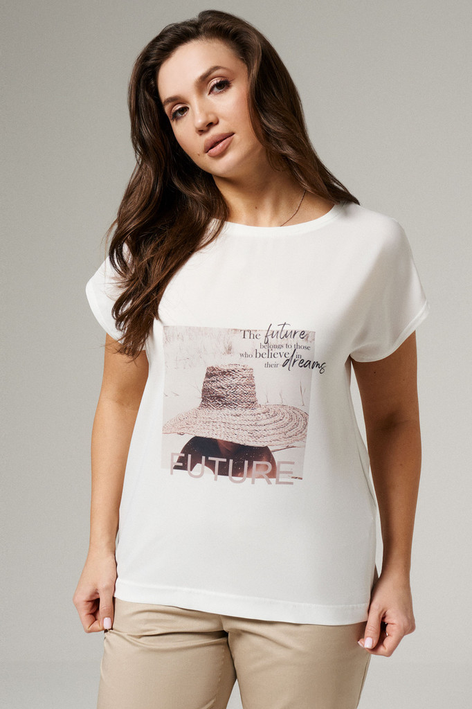 Описание Женская блузка с принтом легко станет акцентной деталью созданного вами летнего образа. В данной блузке перед из лёгкой струящейся ткани, а спинка из приятного на ощупь хлопкового трикотажа, ... Показать описаниемаксимально пропускающего воздух к телу и обеспечивающего комфортные ощущения. Летняя блузка женская прямого кроя спереди украшена по центру дизайнерской печатью. Вырез горловины – круглый, обработан бейкой из трикотажа. Линия плеча слегка спущена. Без рукавов. Она превосходно комбинируется с брюками, джинсами, юбками, шортами. Предлагаем вам купить красивую женскую блузку по приемлемой стоимости. Параметры Рост: 164 42 Блузка: Длина изделия - 59см, Ширина плеча - 23.5см, Ширина по груди - 50см, Ширина по низу - 51см, Ширина рукава под проймой - 21.5см; 44 Блузка: Длина изделия - 59см, Ширина плеча - 24см, Ширина по груди - 52см, Ширина по низу - 53см, Ширина рукава под проймой - 22см; 46 Блузка: Длина изделия - 60см, Ширина плеча - 24.5см, Ширина по груди - 54см, Ширина по низу - 55см, Ширина рукава под проймой - 22.5см; 48 Блузка: Длина изделия - 60см, Ширина плеча - 25см, Ширина по груди - 56см, Ширина по низу - 57см, Ширина рукава под проймой - 23см; 50 Блузка: Длина изделия - 61см, Ширина плеча - 25.5см, Ширина по груди - 58см, Ширина по низу - 59см, Ширина рукава под проймой - 23.5см; 52 Блузка: Длина изделия - 61см, Ширина плеча - 26см, Ширина по груди - 60см, Ширина по низу - 61см, Ширина рукава под проймой - 24см; 54 Блузка: Длина изделия - 62см, Ширина плеча - 26.5см, Ширина по груди - 62см, Ширина по низу - 63см, Ширина рукава под проймой - 24.5см; 56 Блузка: Длина изделия - 62см, Ширина плеча - 27см, Ширина по груди - 64см, Ширина по низу - 65см, Ширина рукава под проймой - 25см; Состав и уход Состав: Полиэстер/polyester 50%; хлопок/cotton 45%; эластан/elastane 5%. Уход: * Стирка при температуре воды до 30°C * Не отбеливать * Гладить при температуре утюга до 110°C * Вертикальная сушка * Барабанная сушка запрещена * Профессиональная сухая чистка в тетрахлорэтилене и во всех растворителях, внесенных в список для символа F.