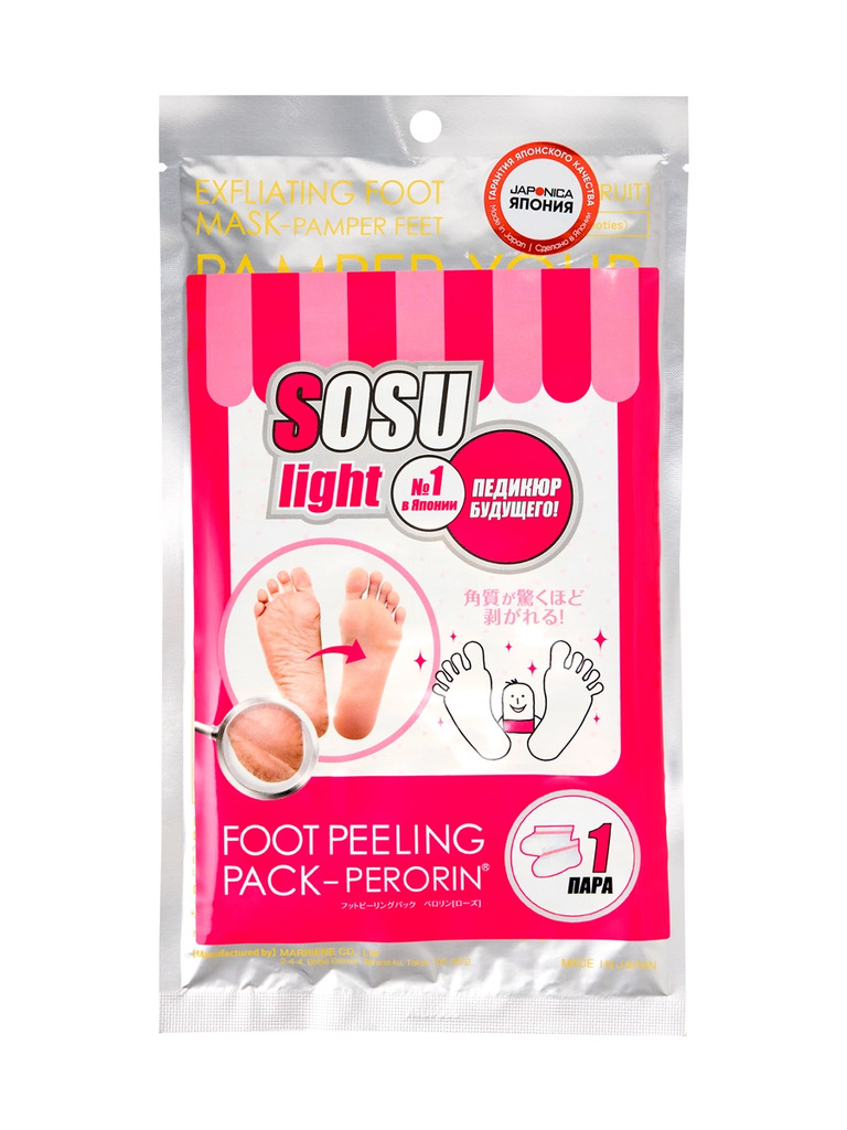 Носочки «SOSU» - это инновационный способ педикюра на дому без риска и траты времени на посещение дорогостоящих процедур. «SOSU» – новое слово в косметологии, разработанное японскими специалистами, ко... Показать описаниеторое уже по достоинству оценили женщины страны «Восходящего Солнца», вверив самой природе заботу о своих ножках. Основной компонент активного вещества - молочная кислота и растительные экстракты лопуха, лимона, плюща, жерухи, шалфея, мыльнянки и др., стимулирующие естественный процесс отторжения мертвых тканей. Оказывают терапевтическое и эстетическое действие, быстро и безопасно решают косметологические проблемы стоп. Первый эффект заметен через 3-5 дней. Спустя две недели после применения кожа становится гладкой и упругой, сохраняя эффект в течение долгого времени. -Устранение трещин, потертостей и мозолей. -Противогрибковый эффект. -Улучшение эстетических качеств кожи ступни.