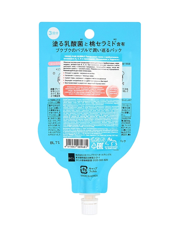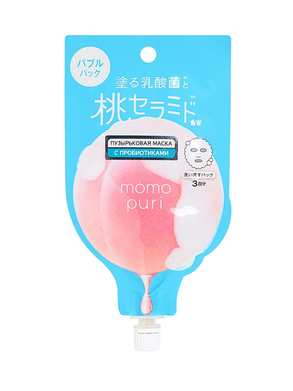 Японская кислородная пузырьковая маска для лица Momo Puri с пробиотиками, керамидами, витаминами А, С, Е. При нанесении начинает пенится и мягко массирует кожу маленькими пузырьками. Благодаря пенящей... Показать описаниеся формуле маска очищает, удаляет загрязнения из пор, увлажняет и освежает кожу. Способствует сужению пор и возвращению здорового сияния. Обладает ароматом свежих персиков. Используйте маску, когда вас беспокоит сухость и тусклость кожи. Упаковка рассчитана на 3 применения. Косметика с пробиотиками рекомендуется для восстановления микробиома кожи; после солнца, стрессов и рутинного ухода; после наружного применения антибиотиков; для профилактики возрастных изменений. Результат: • Очищает и удаляет загрязнения из пор • Увлажняет и улучшает текстуру кожи • Сужает поры • Защищает микробиом от воздействия вредных бактерий • Восстанавливает и укрепляет защитный барьер кожи • Уменьшает раздражения и покраснения Рекомендуется для всех типов кожи. Активные компоненты Пробиотики способствуют восстановлению микробиома кожи, защищают кожу от внешней среды, выравнивают тон лица, помогают сохранить оптимальный уровень увлажненности кожи и укрепляют ее защитный барьер. Витамин А (ретинол) обладает хорошими омолаживающими, увлажняющими и отшелушивающими свойствами. Витамин С увлажняет, налаживает выработку собственного коллагена, оказывает мощное антиоксидантное действие. Витамин Е (токоферол) обновляет клетки кожи и устраняет повреждения, вызванные воздействием ультрафиолетовых лучей. Керамиды японских персиков восстанавливают защитный барьер, питают, тонизируют, увлажняют и снимают раздражения. Гиалуроновая кислота глубоко увлажняет и повышает упругость. Экстракт бергамота увлажняет, успокаивает, выравнивает тон кожи лица. Продукция бренда Momo Puri не тестируется на животных.
