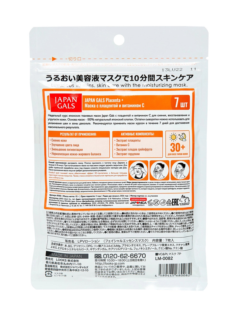 JAPAN GALS Placenta + Маска с плацентой и витамином C 7 штВопросы по товару