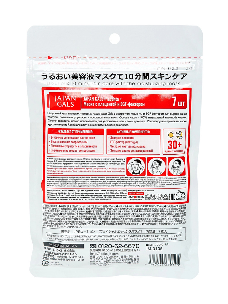 JAPAN GALS Placenta + Маска с плацентой и EGF фактором 7 штВопросы по товару