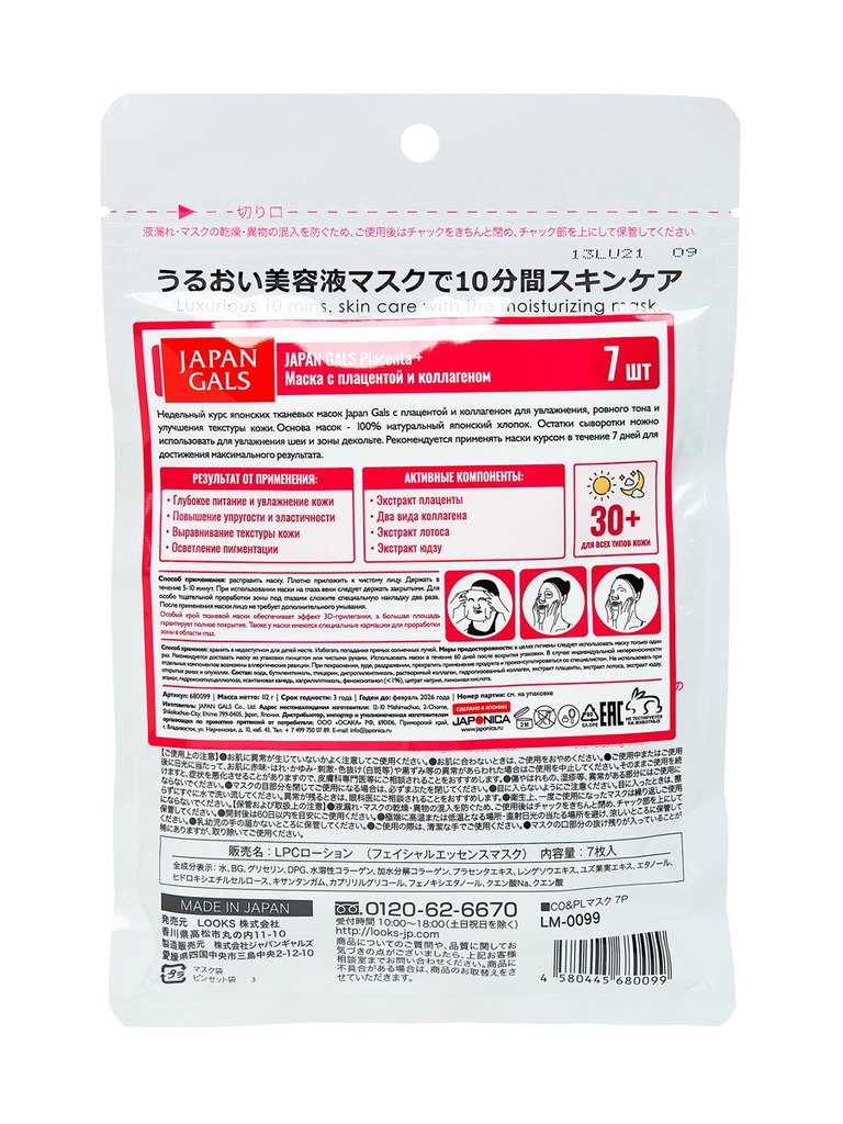JAPAN GALS Placenta + Маска с плацентой и коллагеном 7 штВопросы по товару