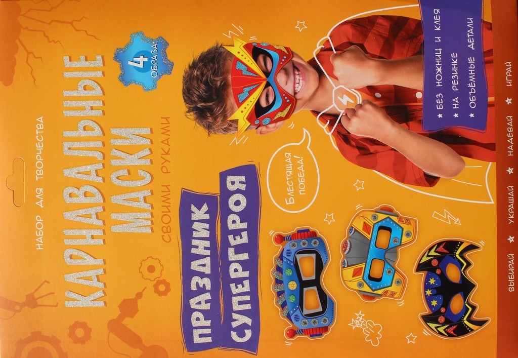 «Праздник супергероя» – набор для настоящих мальчишек! Яркие и блестящие маски станут отличным дополнением игры и праздника – состязание супергероев станет ещё увлекательнее! Ребёнок может сам украсит... Показать описаниеь маску с помощью объёмных деталей, используя входящие в набор клеевые подушечки. Ножницы и клей не понадобятся, маски уже высечены по контуру! Резиночка в комплекте. В наборе 4 образа – выбирай, украшай, надевай и играй! Рекомендованный возраст 5+.