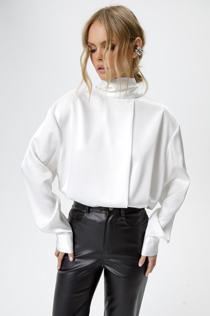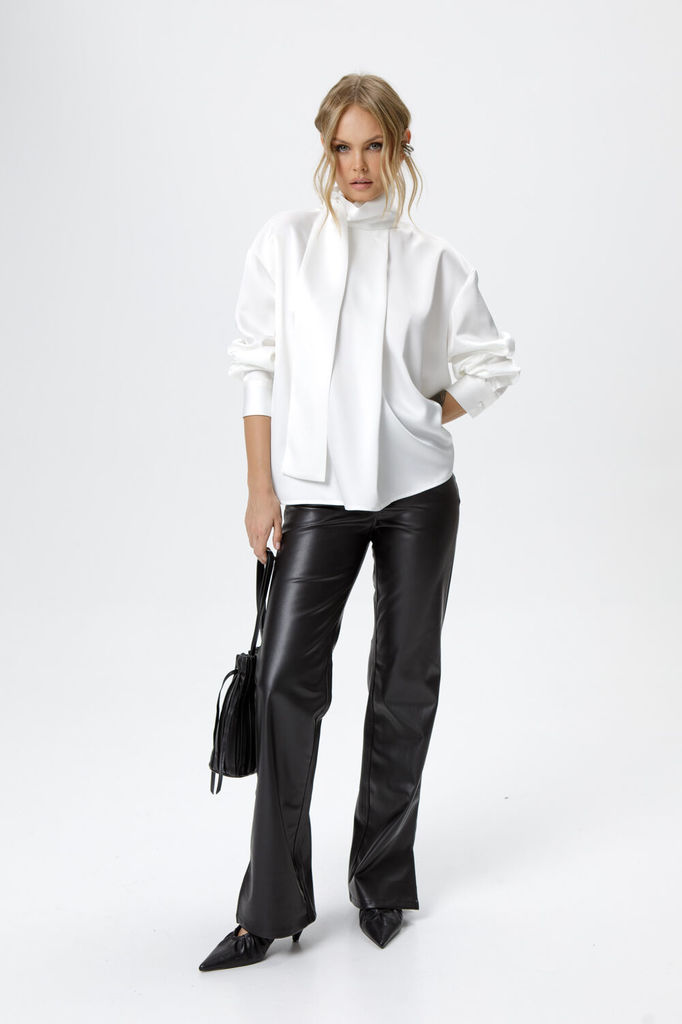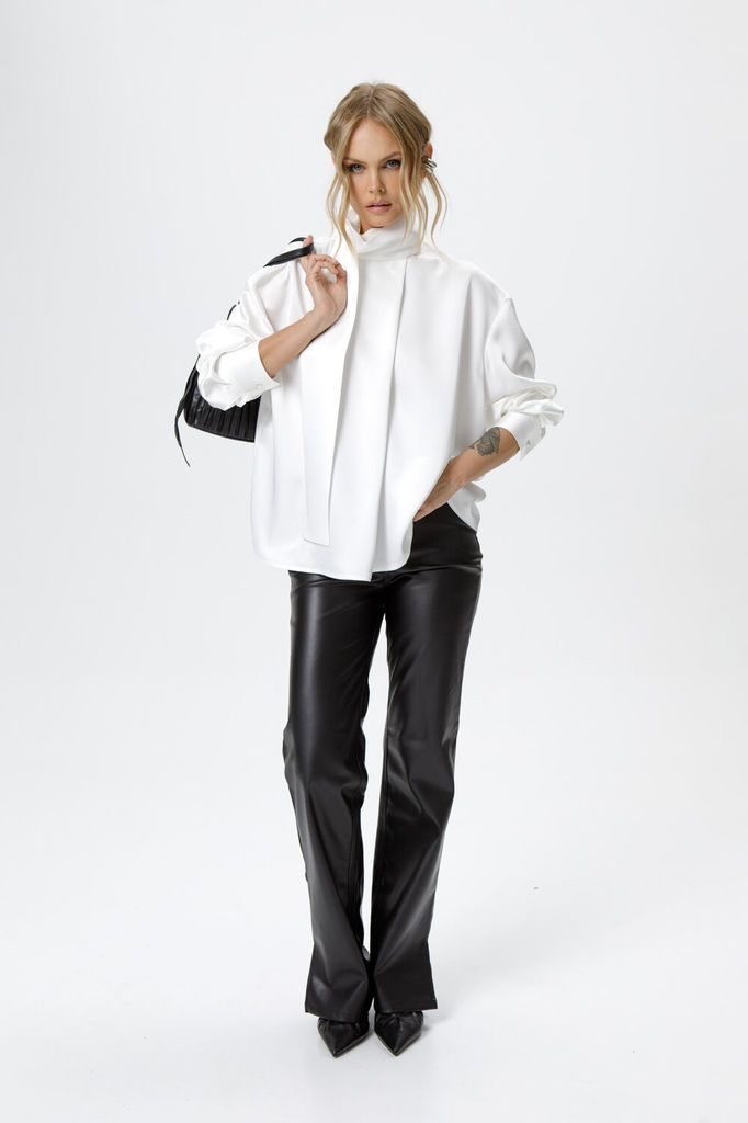 Состав: Вискоза-48%; ПЭ-52%; Сезон: Осень-Зима Рост: 164 Страна бренда: Беларусь Состав: Вискоза-48%; ПЭ-52%; Струящаяся свободная блуза со стойкой-бантом. Детали: прямой силуэт, высокий воротник стой... Показать описаниека с широкими длинными завязками, блуза с глубокой складкой по переду, удлинённая линия плеча, рукава с притачными манжетами и застёжкой на пуговицу. Длина изделия по спинке около 61 см, длина рукава около 60 см