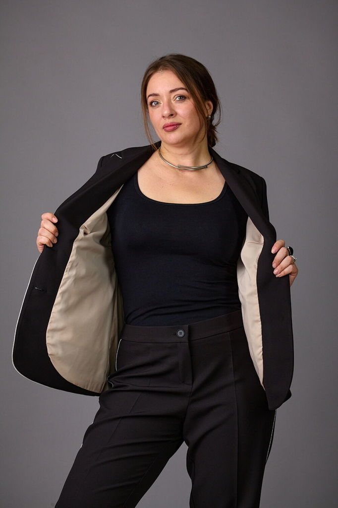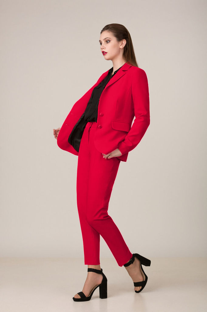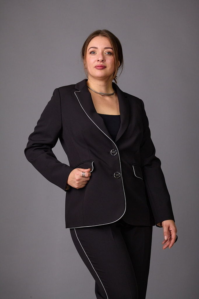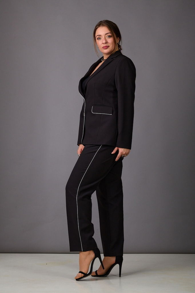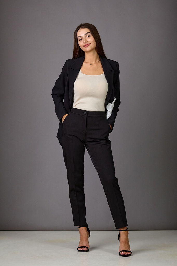 Состав: Костюм- ПЭ-97%; Эластан-3%; Подкладка- ПЭ-100%; Сезон: Осень-Зима Рост: 164 Страна бренда: Беларусь Состав: Костюм: ПЭ-97%; Эластан-3%; Подкладка: ПЭ-100%; Модель отшивается под заказ. Срок по... Показать описаниешива от 3 недель. Брючный комплект из костюмной ткани на подкладке. Двубортный жакет выполнен в стиле оверсайз. Воротник-с отложными лацканами пиджачного типа, рукава - двухшовные. По переду- прорезные карманы с клапанами. Жакет имеет два ряда пуговиц, застегивается на две основные пуговицы, одну потайную, остальные пуговицы несут декоративный характер. Брюки слегка заужены к низу, с двумя наклонными карманами и притачным поясом. Застегиваются на молнию по переду и одну пуговицу. Подходит на рост 164-170.