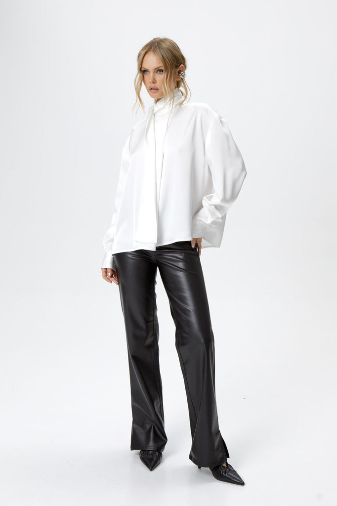 Состав: Вискоза-48%; ПЭ-52%; Сезон: Осень-Зима Рост: 164 Страна бренда: Беларусь Состав: Вискоза-48%; ПЭ-52%; Струящаяся свободная блуза со стойкой-бантом. Детали: прямой силуэт, высокий воротник стой... Показать описаниека с широкими длинными завязками, блуза с глубокой складкой по переду, удлинённая линия плеча, рукава с притачными манжетами и застёжкой на пуговицу. Длина изделия по спинке около 61 см, длина рукава около 60 см