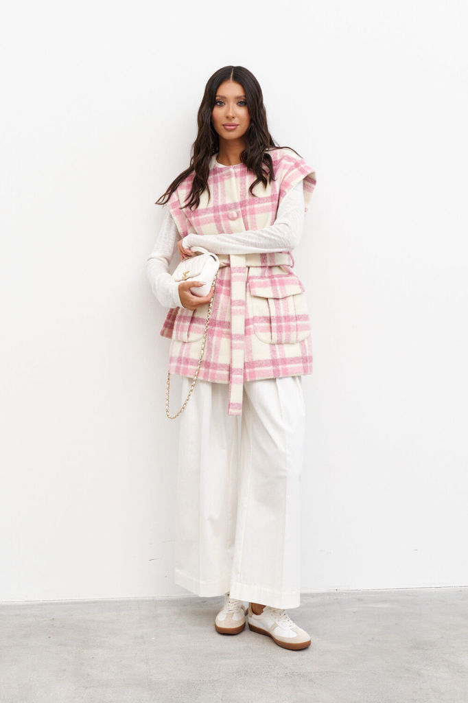 Состав: ПЭ-100%; Сезон: Осень-Зима Рост: 170 Страна бренда: Беларусь Состав: ПЭ-100%; Жилет прямого кроя с пуговицами, декорированными тканью основного изделия, выполнен из плотной пальтовой ткани мол... Показать описаниеочного цвета в розовую клетку. Характеристики: бежевая подкладка, овальная горловина, застежка центральная на петли пуговички, по передней части два крупных накладных кармана, по линии талии нашиты шлевки, в комплекте пояс из ткани основного изделия. Длина изделия 73 см.