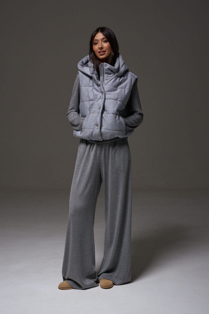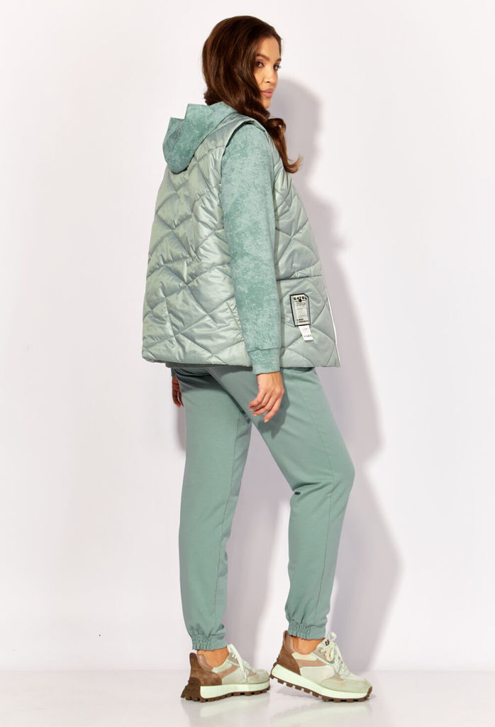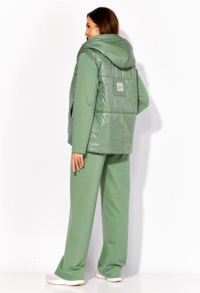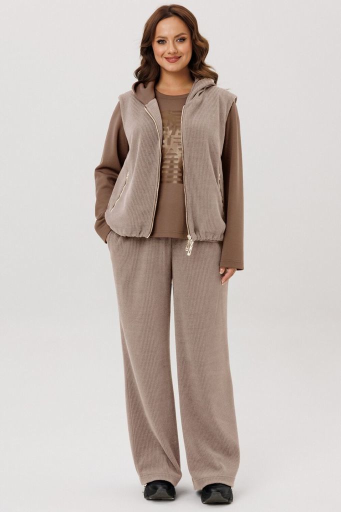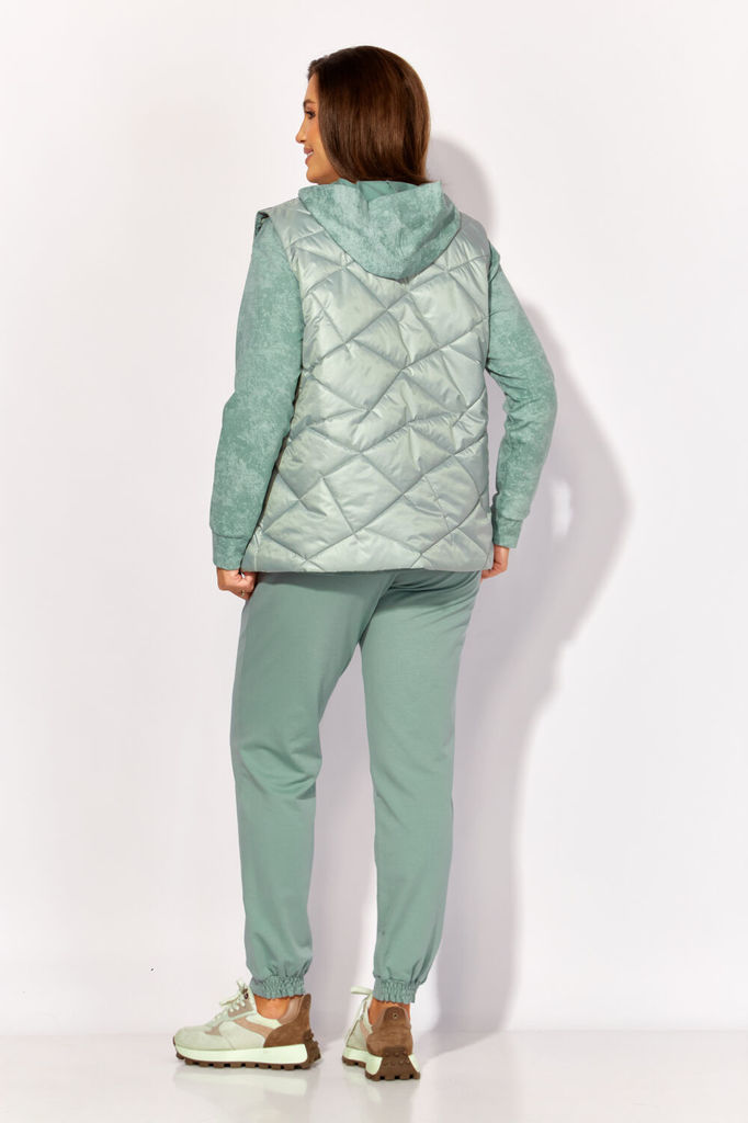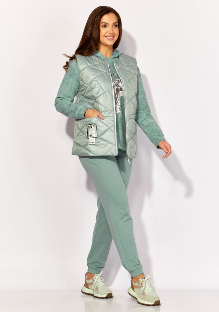 Состав: Жилет- ПЭ-100%; Костюм- ПЭ-30%; Хлопок-70%; Сезон: Осень-Зима Рост: 164 Страна бренда: Беларусь Состав: Жилет: ПЭ-100%; Костюм: ПЭ-30%; Хлопок-70%; Комплект женский, 3х предметный, состоящий и... Показать описаниез жилета, свитшота и брюк. Жилет прямого силуэта, плащевка на синтепоне (VS-100), простеган широкими горизонтальными строчками, на подкладке. По переду рельефы и карманы с "листочкой" Застежка центральная на кнопки. Горловина оформлена капюшоном. На спинке отделочная деталь с нашивкой. Низ жилета сзади удлиннен. Свитшот прямого силуэта с длинным втачным рукавом. Перед задекорирован принтом. Горловина круглой формы с подрезной бейкой с открытым краем. Брюки прямые с наклонными карманами. По центру передних деталей рельефы с отделочными строчками. Пояс притачной, по переду гладкий, дальше на резинке по кругу.