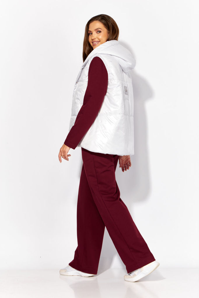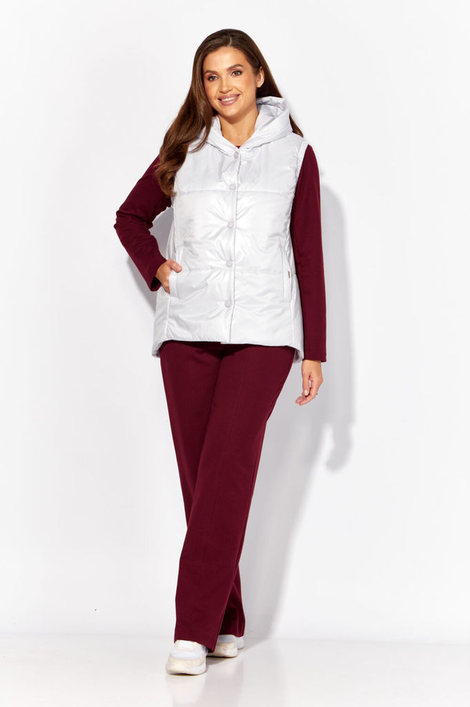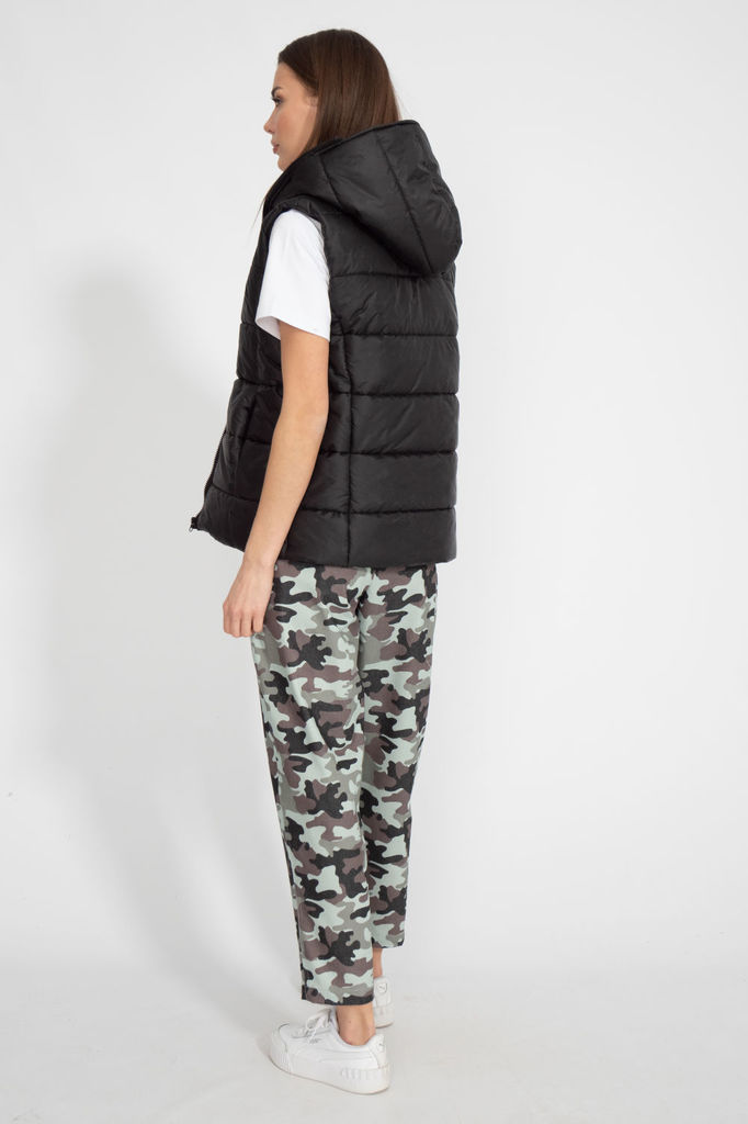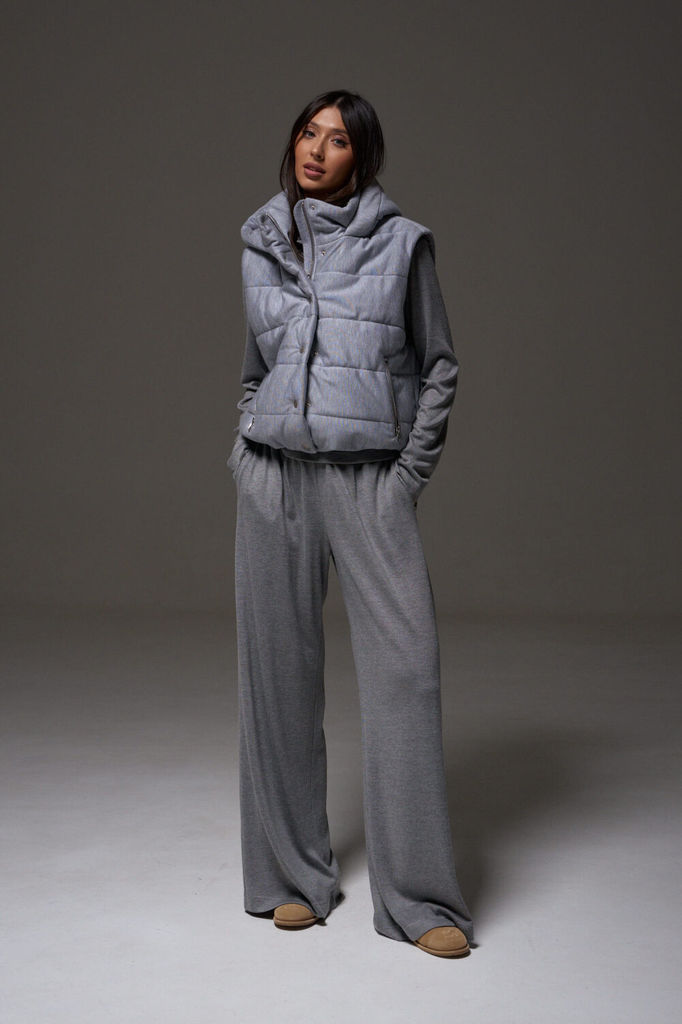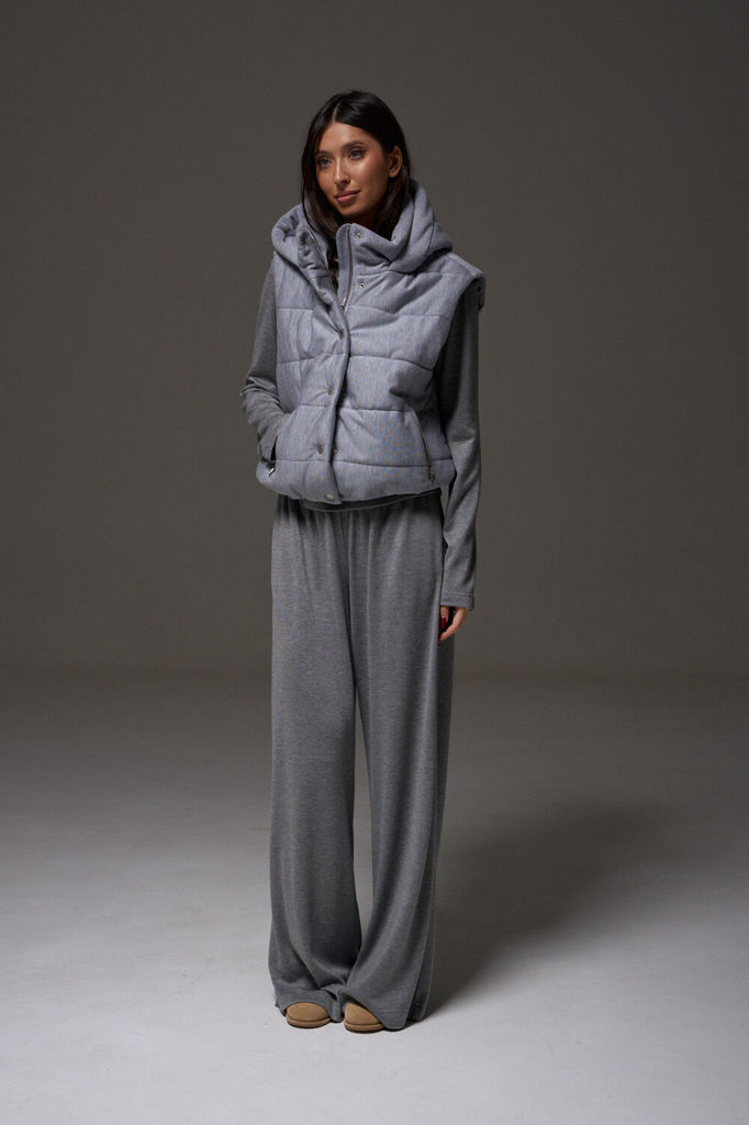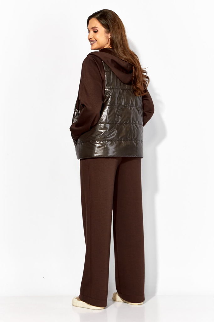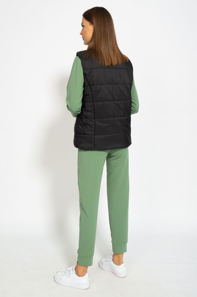 Состав: Жилет- ПЭ-100%; Костюм- ПЭ-30%; Хлопок-70%; Сезон: Осень-Зима Рост: 164 Страна бренда: Беларусь Состав: Жилет: ПЭ-100%; Костюм: ПЭ-30%; Хлопок-70%; Комплект женский, 3х предметный, состоящий и... Показать описаниез жилета, свитшота и брюк. Жилет прямого силуэта, плащевка на синтепоне (VS-100), простеган широкими горизонтальными строчками, на подкладке. По переду рельефы и карманы с "листочкой" Застежка центральная на кнопки. Горловина оформлена капюшоном. На спинке отделочная деталь с нашивкой. Низ жилета сзади удлиннен. Свитшот прямого силуэта с длинным втачным рукавом. Перед задекорирован принтом. Горловина круглой формы с подрезной бейкой с открытым краем. Брюки прямые с наклонными карманами. По центру передних деталей рельефы с отделочными строчками. Пояс притачной, по переду гладкий, дальше на резинке по кругу.