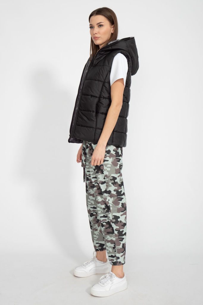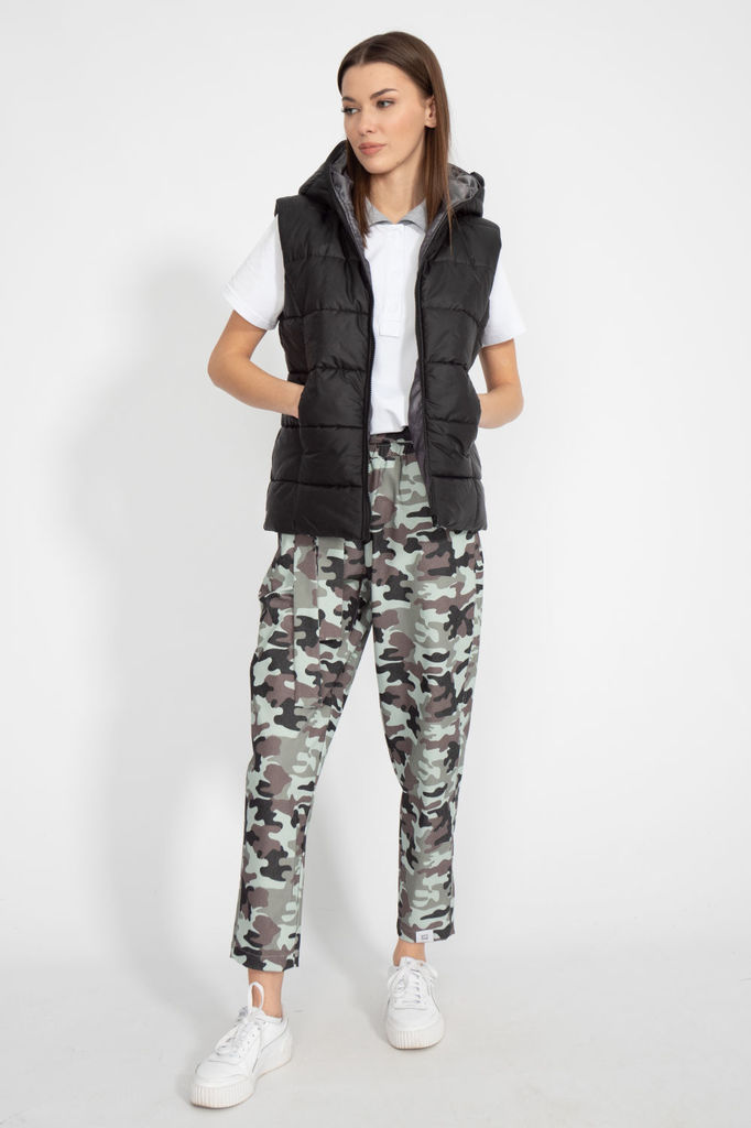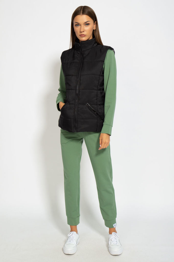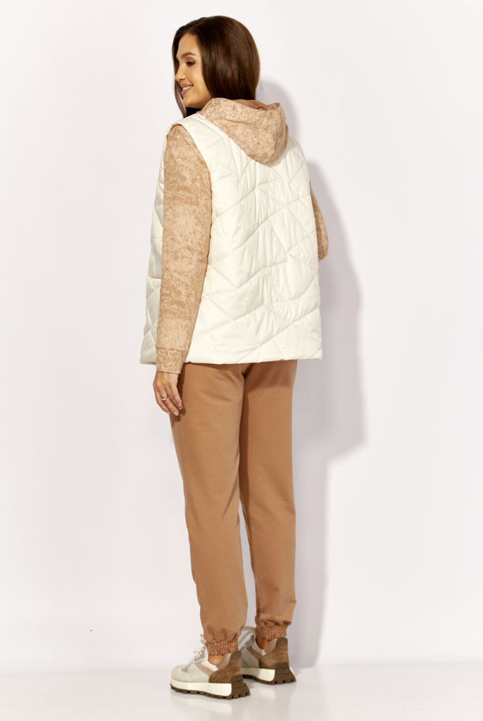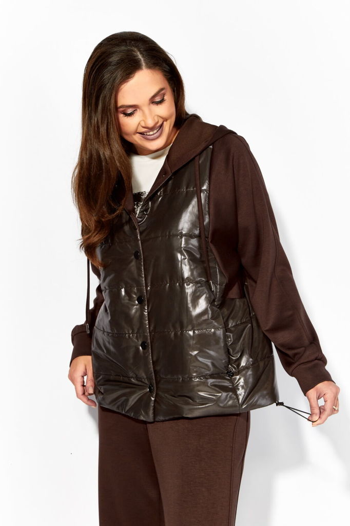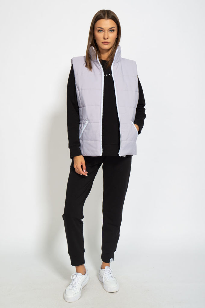 Состав: Жилет- ПЭ-100%; Костюм- ПЭ-30%; Хлопок-70%; Сезон: Осень-Зима Рост: 164 Страна бренда: Беларусь Состав: Жилет: ПЭ-100%; Костюм: ПЭ-30%; Хлопок-70%; Комплект женский, 3х предметный, состоящий и... Показать описаниез жилета, свитшота и брюк. Жилет прямого силуэта, плащевка на синтепоне (VS-100), простеган широкими горизонтальными строчками, на подкладке. По переду рельефы и карманы с "листочкой" Застежка центральная на кнопки. Горловина оформлена капюшоном. На спинке отделочная деталь с нашивкой. Низ жилета сзади удлиннен. Свитшот прямого силуэта с длинным втачным рукавом. Перед задекорирован принтом. Горловина круглой формы с подрезной бейкой с открытым краем. Брюки прямые с наклонными карманами. По центру передних деталей рельефы с отделочными строчками. Пояс притачной, по переду гладкий, дальше на резинке по кругу.