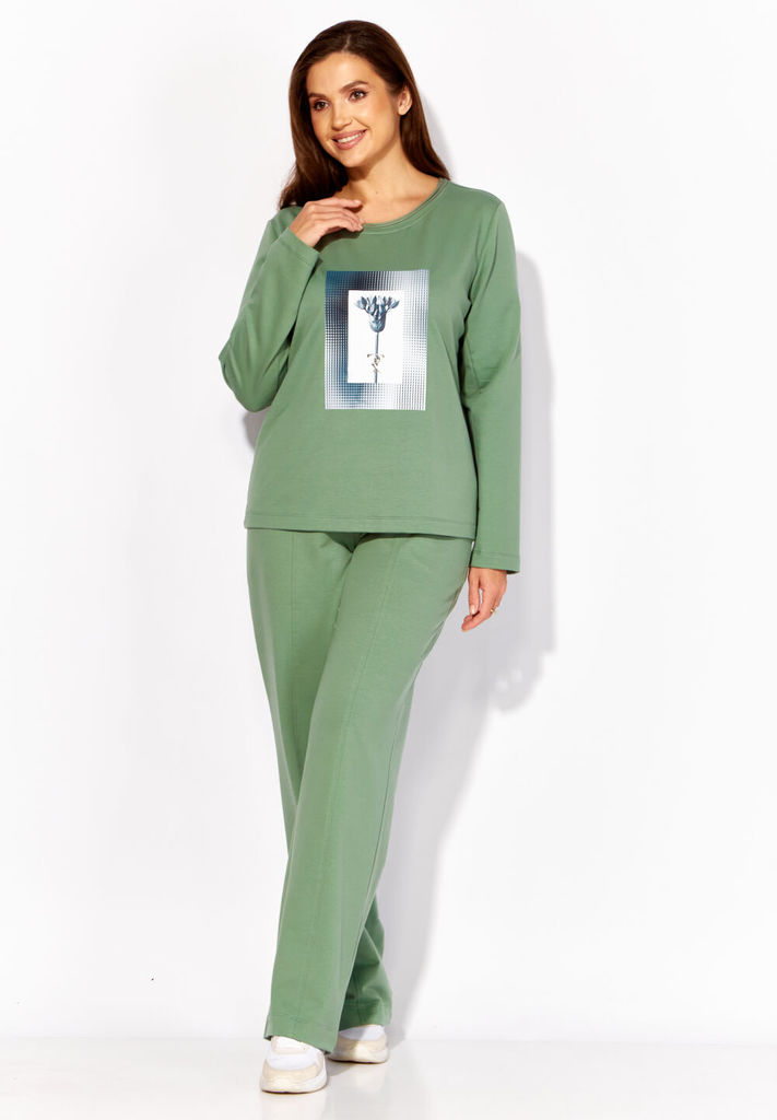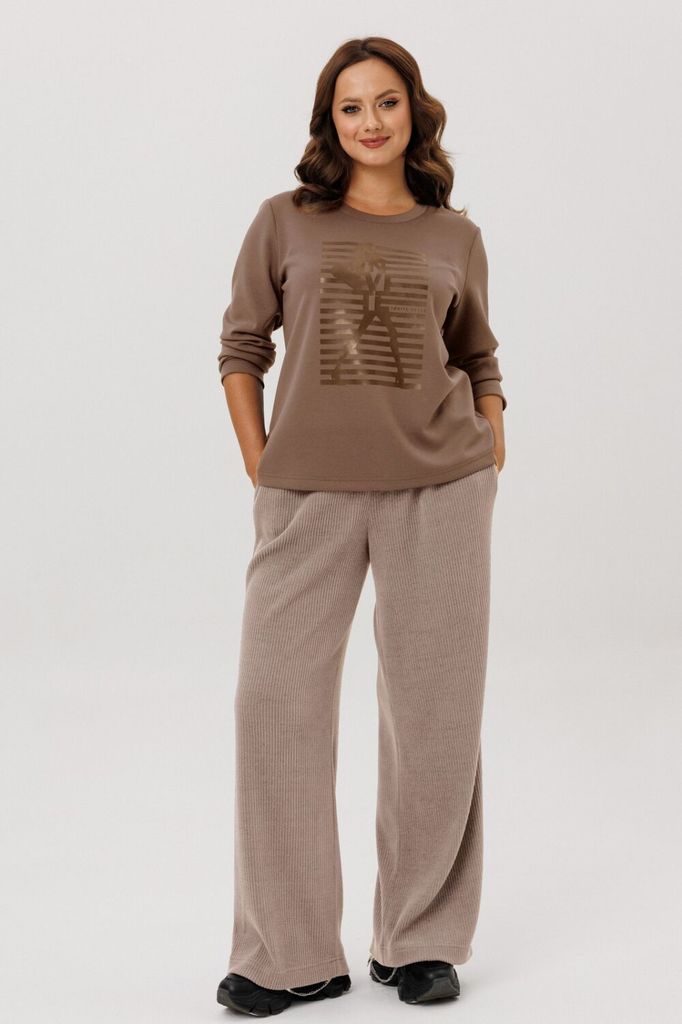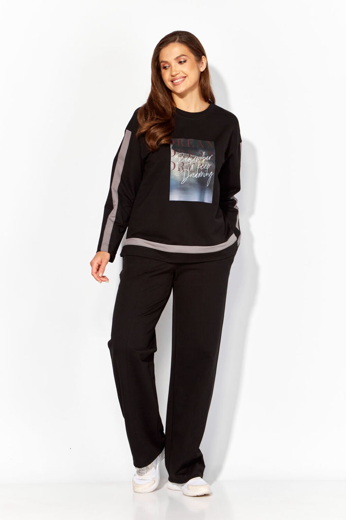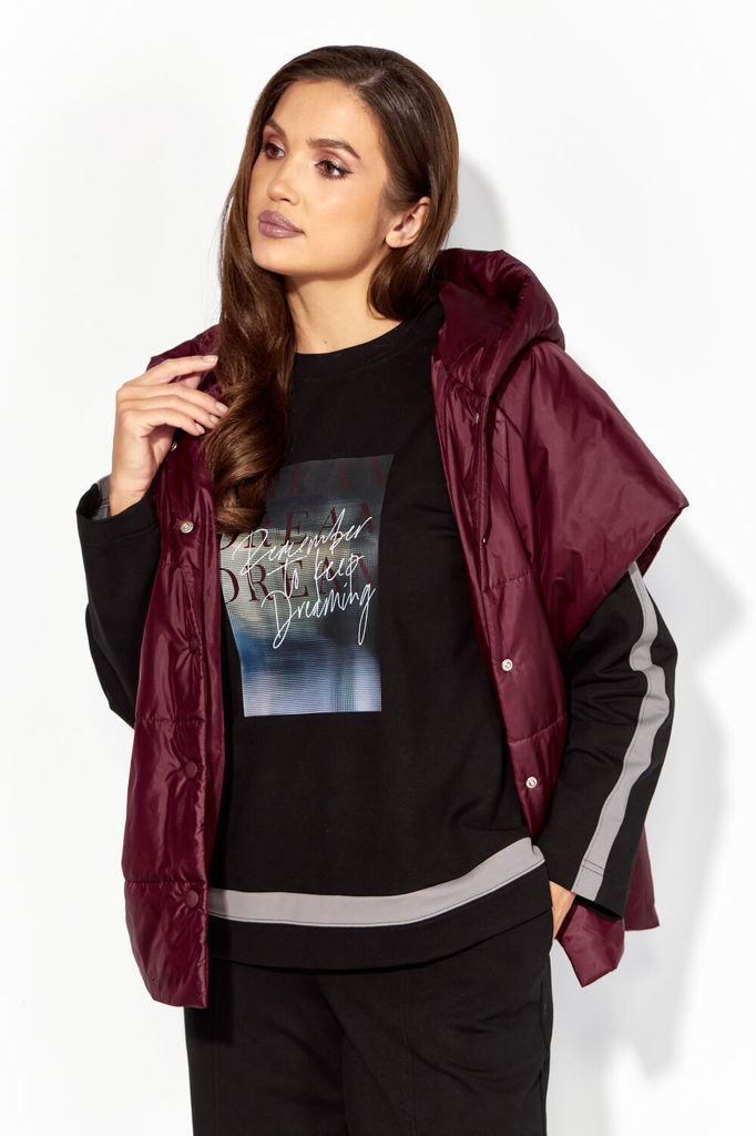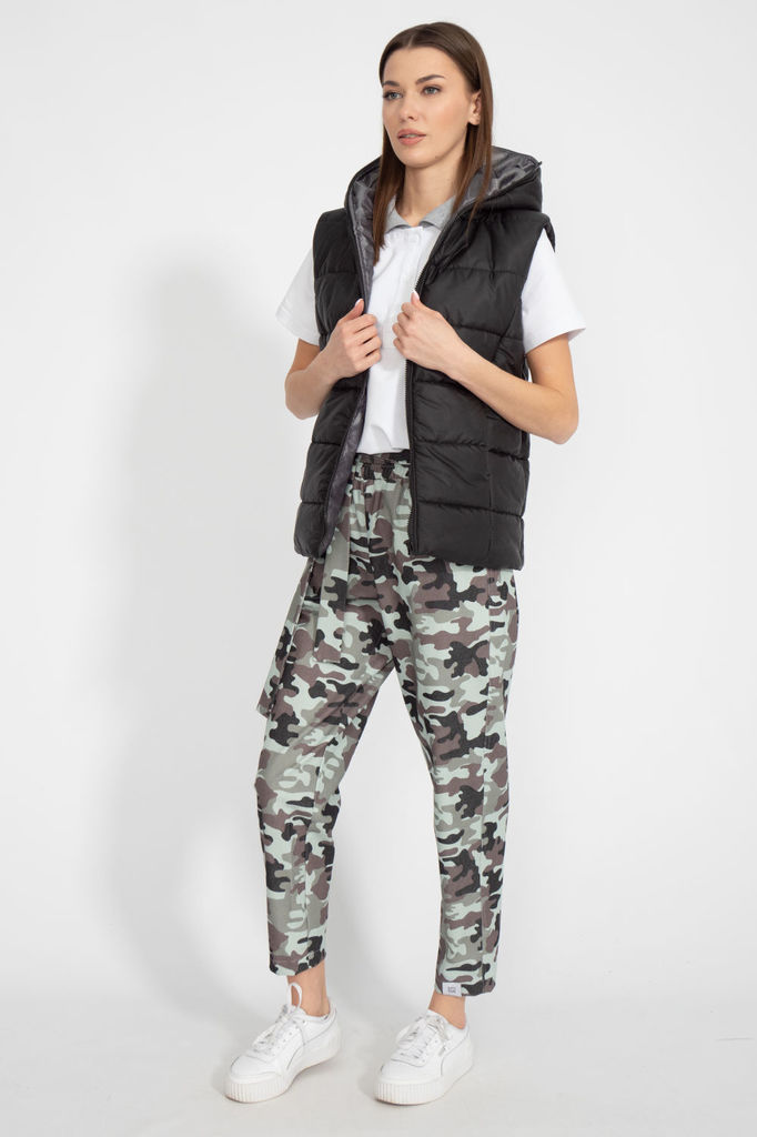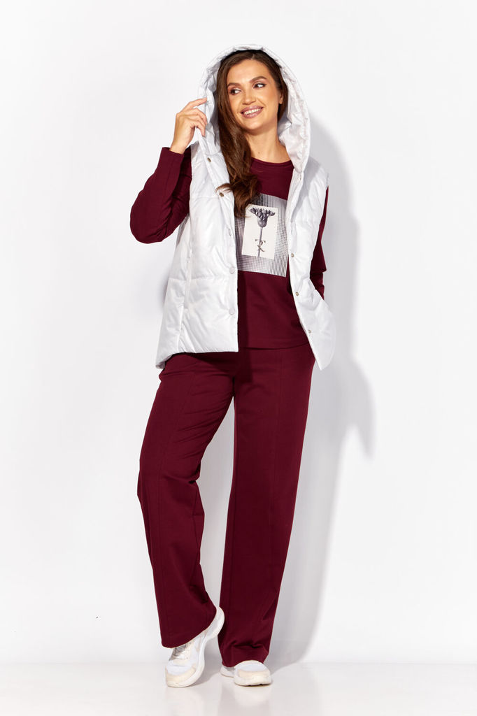 Сезон: Осень-Зима Рост: 164 Страна бренда: Беларусь Комплект женский, 3х предметный, состоящий из свитшота, брюк и жилета. Свитшот прямого силуэта с длинным рукавом. Рукав со спущенной линией плеча. Г... Показать описаниеорловина круглой формы с подрезной бейкой. По центру рукавов и низу свитшота вставки(полоски) из полотна контрастного цвета. По бокам разрезы. Перед задекорирован принтом. Брюки прямые, с карманами. Спереди рельефы с отделочными строчками. Пояс притачной, частично на резинке. Жилетка прямого силуэта со спущенным рукавом "реглан" По переду рельефы и карманы в рельефах. Спинка и центральная часть переда простеганы. Застежка центральная, на кнопки. Горловина оформлена капюшоном. Низ жилета, по спинке, слегка удлинён. На спинке декоративная нашивка. Жилет изготовлен из плащевой ткани, на синтепоне(VS-100) и на подкладке