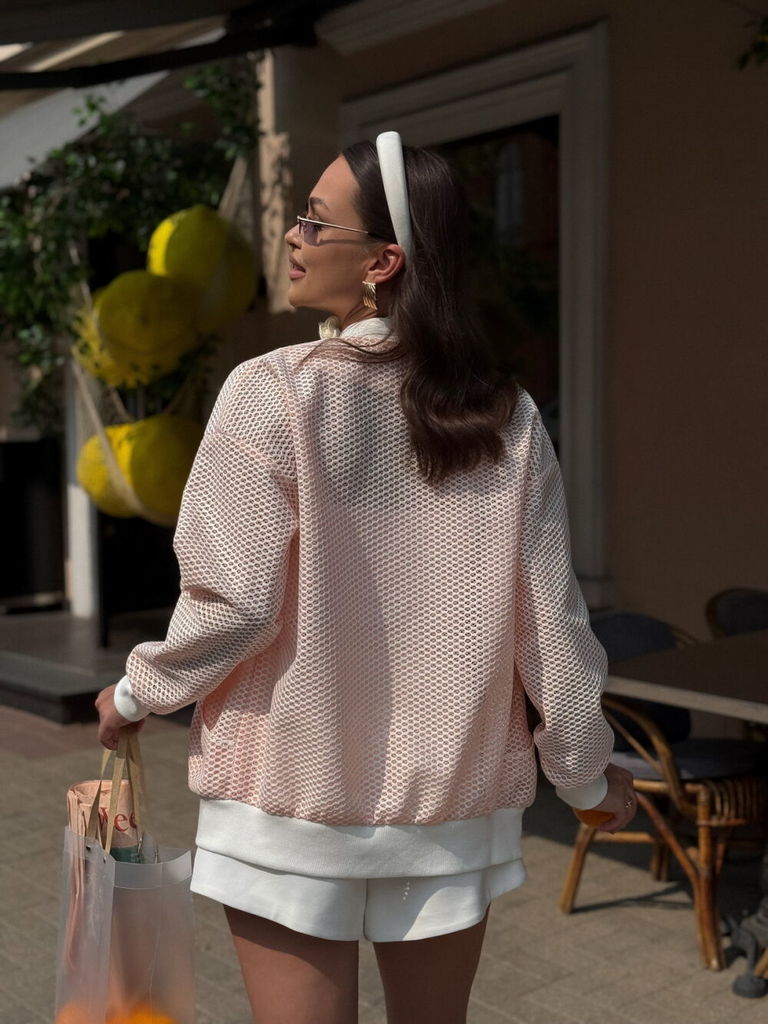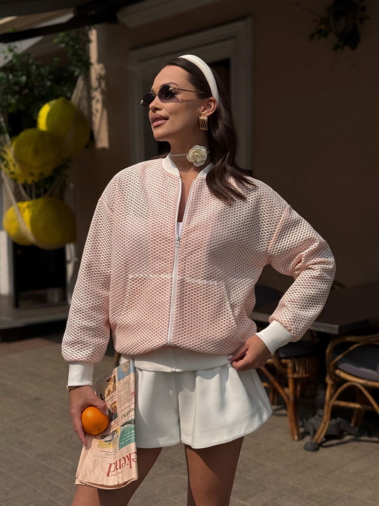 Состав: ПЭ-100%; Сезон: Лето Рост: 164 Страна бренда: Беларусь Состав: ПЭ-100%; Жакет - бомбер женский, прямого силуэта, со спущенной линией плечевого шва, выполнен из трикотажногосетчатого полотна. С... Показать описаниепинка без конструктивных особенностей. Перед с застежкой на тесьму-молнию. По переду обработаны накладные карманы-кенгуру. Низ изделия обработан притачными планками из отделочной ткани. Рукава втачные, одно шовные. По низу рукава притачные манжеты из отделочной ткани. Воротник стойка с закругленным концом из отделочной ткани. Длина рукава — 63 см Длина жакета — 51,5 см