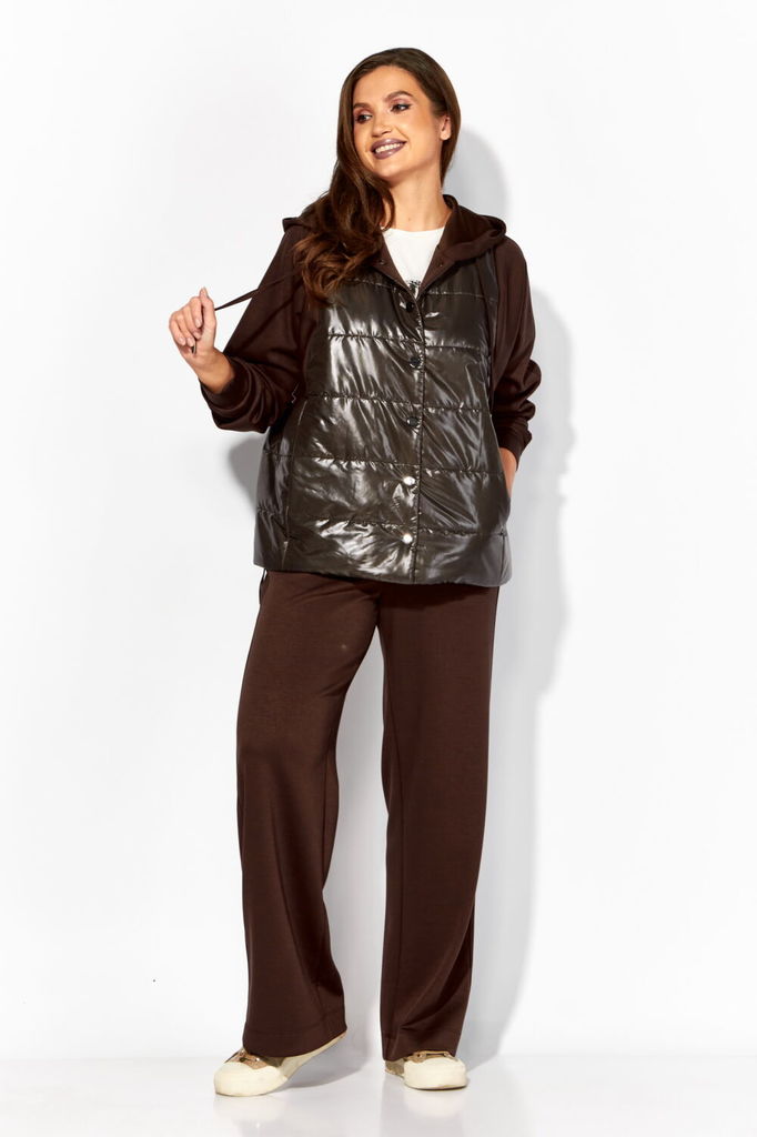 Состав: Куртка- ПЭ-100%; Брюки- Вискоза-67%; Спандекс-5%; Нейлон-28%; Сезон: Осень-Зима Рост: 164 Страна бренда: Беларусь Состав: Куртка: ПЭ-100%; Брюки: Вискоза-67%; Спандекс-5%; Нейлон-28%; Комплект... Показать описание женский, 2х предметный, состоящий из куртки и брюк. Куртка прямого силуэта. Выполнена на сочетании стеганной плащевки на синтепоне (VS 100) и трикотажного полотна (фенди) Центральная часть переда и спинки из стежки. По переду центральная застежка на кнопки и карманы в рельефах. Горловина оформлена капюшоном с кулисой по краю. Рукав цельнокройный, с манжетой снизу. Низ куртки по ширине регулируется внутренней кулисой (резинка) с фиксаторами. Стежка на подкладке. Брюки прямые. По боку подрезной лампас с отделочной строчкой и карманы. Пояс притачной , по переду гладкий, дальше с резинкой по кругу.