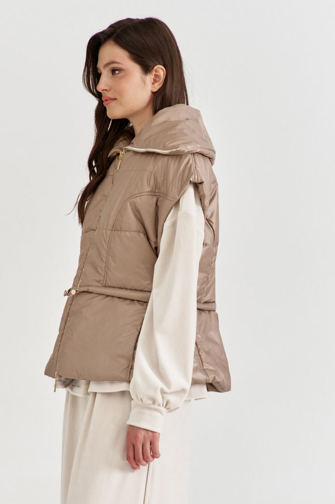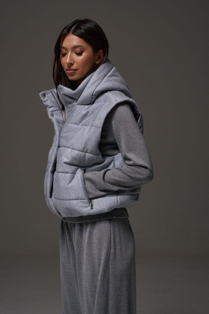 Состав: Вискоза-38%; ПЭ-24%; Шерсть-5%; ПАН-33%; Сезон: Осень-Зима Рост: 170 Страна бренда: Беларусь Состав: Вискоза-38%; ПЭ-24%; Шерсть-5%; ПАН-33%; Жилет укороченный, выполнен из стеганной трикотажн... Показать описаниеой ткани серого цвета. Характеристика: жилет А-силуэта, вортник стойка, капюшон цельный с жилетом, центральная застежка на молнию, скрывается под планкой на кнопках, боковые карманы на молнии, по низу изделия резинка с фиксаторами, брендированный подклад, спинка цельнокройная. Длина изделия от края горловины по спинке 58см.