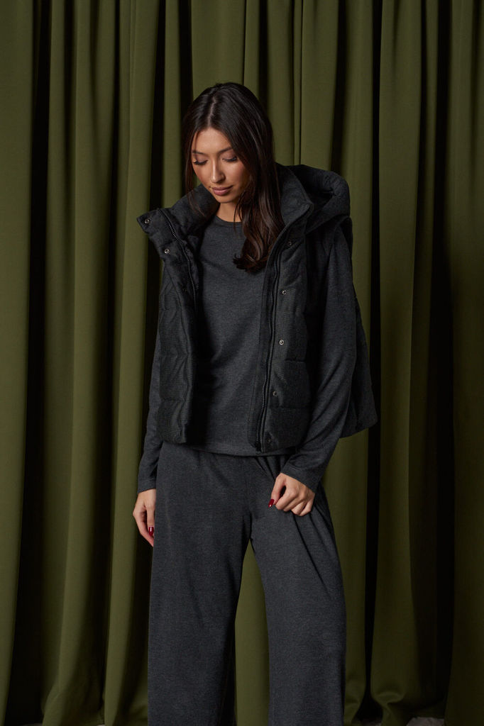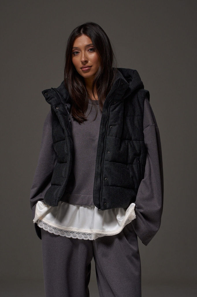 Состав: Вискоза-38%; ПЭ-24%; Шерсть-5%; ПАН-33%; Сезон: Осень-Зима Рост: 170 Страна бренда: Беларусь Состав: Вискоза-38%; ПЭ-24%; Шерсть-5%; ПАН-33%; Жилет укороченный, выполнен из стеганной трикотажн... Показать описаниеой ткани графитового цвета. Характеристика: жилет А-силуэта, вортник стойка, капюшон цельный с жилетом, центральная застежка на молнию, скрывается под планкой на кнопках, боковые карманы на молнии, по низу изделия резинка с фиксаторами, брендированный подклад, спинка цельнокройная. Длина изделия от края горловины по спинке 58см.