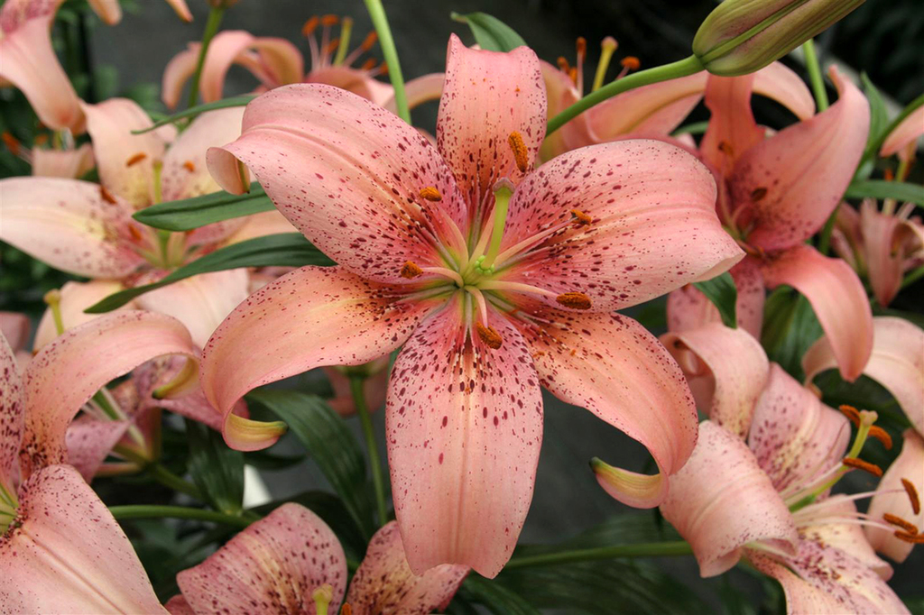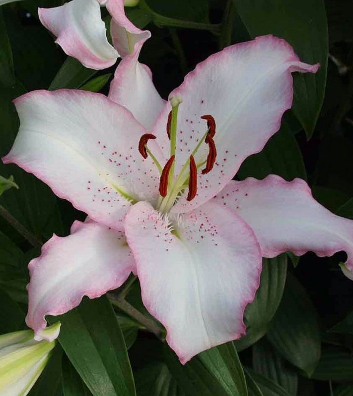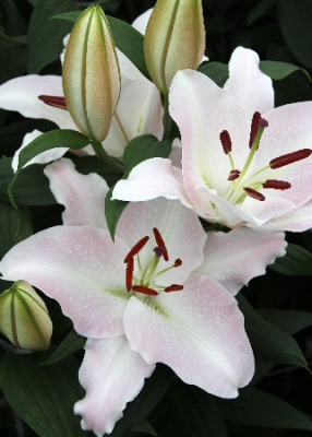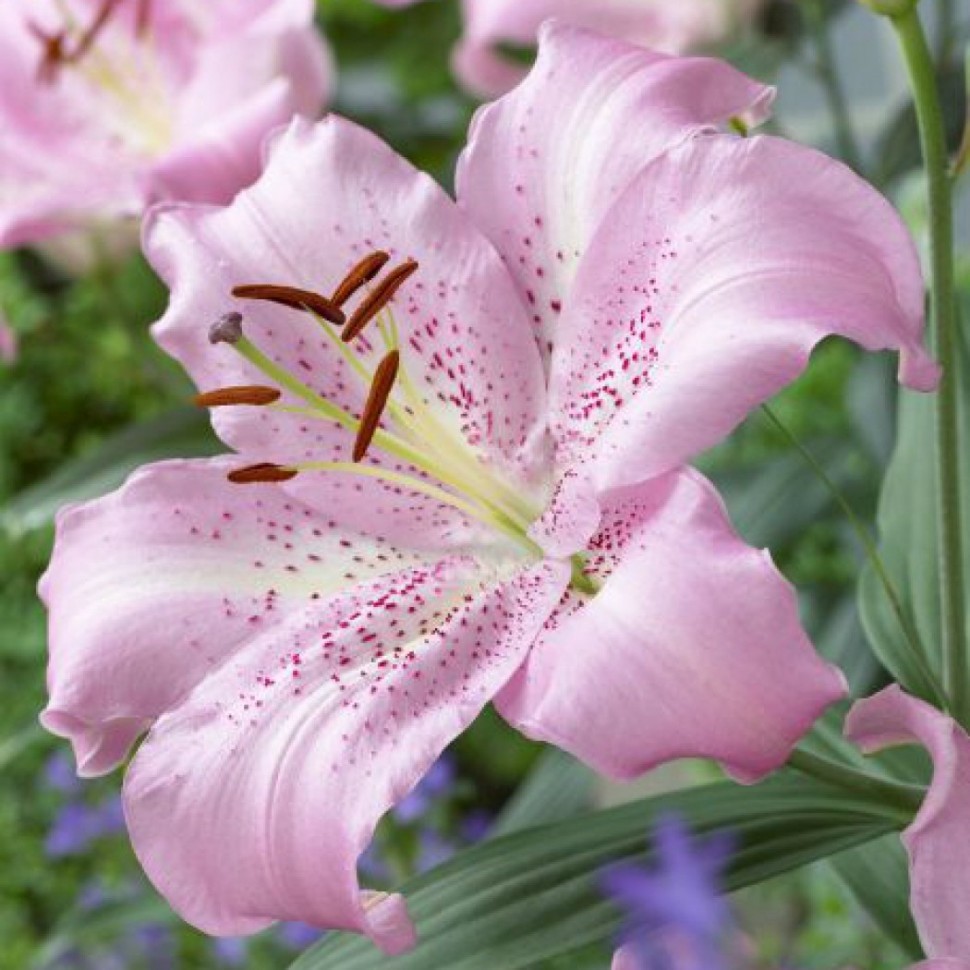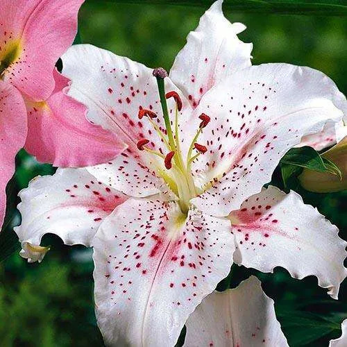 Восточный гибрид лилии нежно-розового цвета с белым переливом и красным крапом, лепестки слегка гофрированные. Время цветения - июль-сентябрь. Высота - 100 см.
