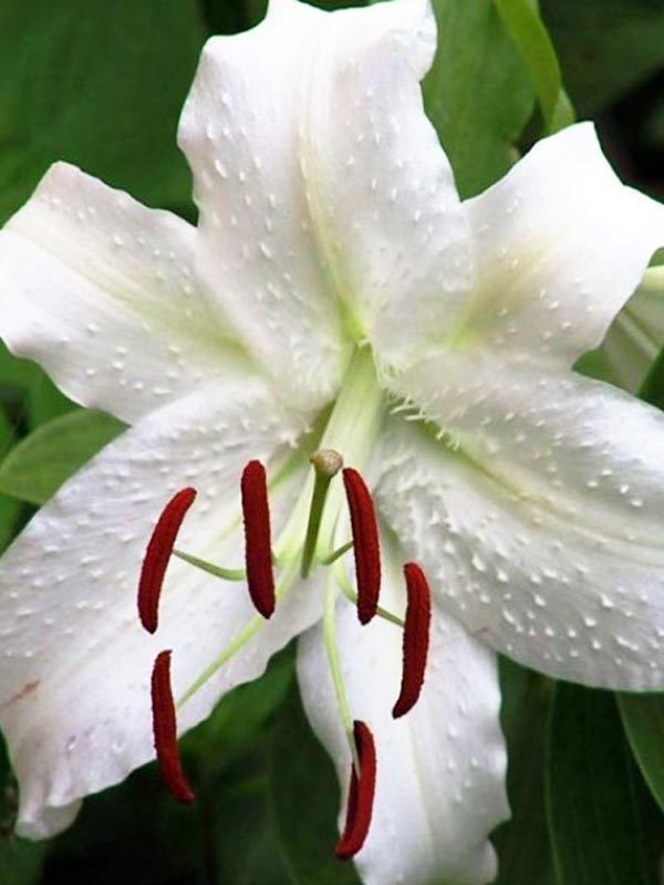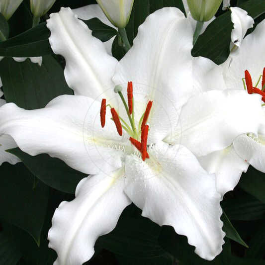 НОВИНКА Величественный цветок с чисто-белыми волнистыми лепестками. Известен своим потрясающим, сладким ароматом и крупными (в диаметре до 25 см), эффектными цветками. Высота растения - до 110 см.