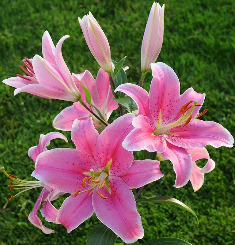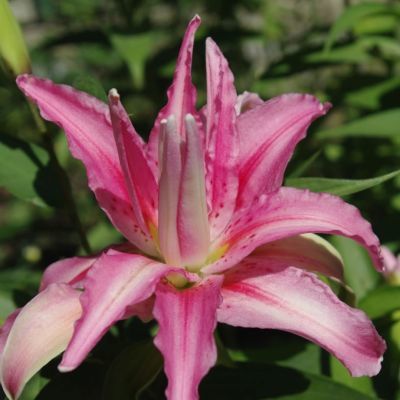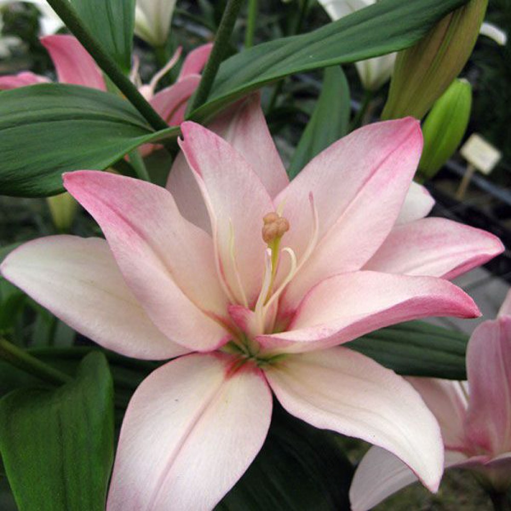 Восточная лилия, с нежными, волнистыми по краям лепестками. Розовый и бледно-розовый цвет лепестков с белой каймой. В высоту достигает 120 см.