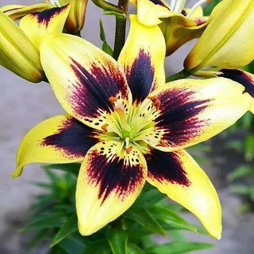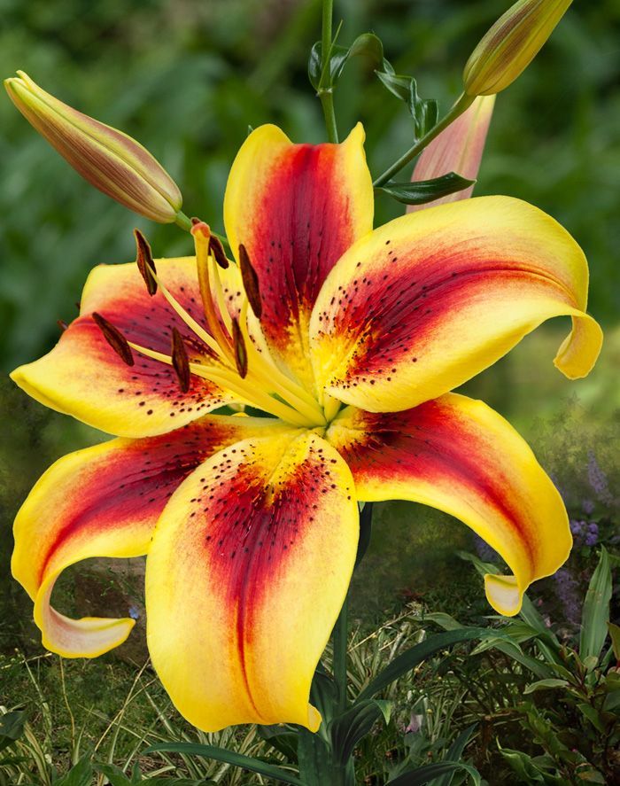 НОВИНКА Цветок с ярко-желтыми лепестками и темно-бордовыми пятнами у основания лепестков. Не имеет запаха. Период цветения июнь-июль. Высота растения - 110 см, диаметр цветка - 17 см.