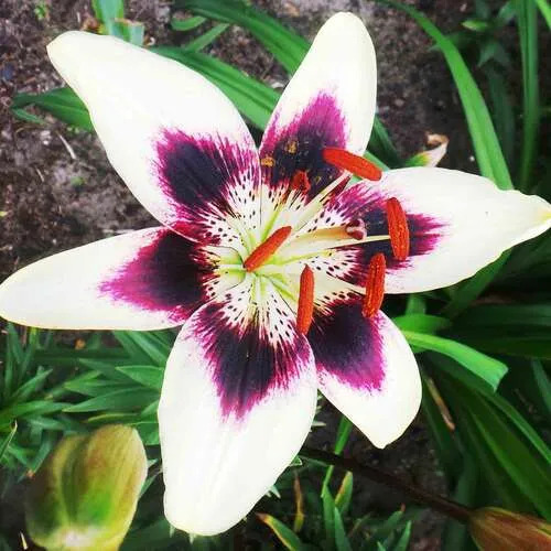 Цветок белый с винно-бордовым напылением в центре. Размер цветка - от 7,5 до 15 см. Высота взрослого растения - 100 см.